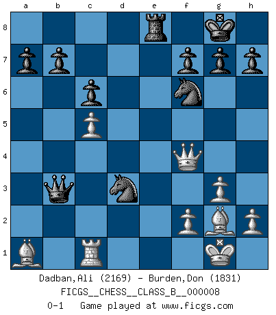 Last move : 0-1 2007 January 30 22:14:7 [Event "FICGS__CHESS__CLASS_B__000008"] [Site "FICGS"] [Date "2006.11.22"] [Round "1"] [White "Dadban,Ali"] [Black "Burden,Don"] [Result "0-1"] [WhiteElo "2169"] [BlackElo "1831"] 1.Nf3 d5 2.c4 c6 3.b3 dxc4 4.bxc4 e5 5.Bb2 e4 6.Nd4 Nf6 7.g3 Be7 8.Bg2 Na6 9.O-O O-O 10.d3 Qb6 11.Nb3 exd3 12.exd3 Bg4 13.Qd2 Rad8 14.Nc3 Bf5 15.d4 Qb4 16.Rac1 Rfe8 17.Qf4 Bd3 18.Rfe1 Bxc4 19.Ne4 Bxb3 20.axb3 Qxb3 21.Ba1 Nb4 22.Nc5 Bxc5 23.dxc5 Nd3 24.Rxe8+ Rxe8 0-1 Reti Opening Kingside Castling by player White (move 9) Kingside Castling by player Black (move 9) Player Black won this chess game. Follow this game move after move (download)Chess holds its master in its own bonds, shackling the mind and brain so that the inner freedom of the very strongest must suffer. (Albert Einstein) Wie kann ich Remis annehmen? Ich weiß ja gar nicht, wie ich stehe! (Fritz Sämisch) Sin errores no puede haber brillantez. (Emanuel Lasker) Les pièces de l'échiquier étaient impitoyables. Elles le retenaient, elles l'absorbaient. Il y avait de l'horreur en cela, mais aussi une harmonie unique. Car, qu'y a-t-il dans le monde, à part les échecs ? (V. Nabokov) For to win one hundred victories in one hundred battles is not the acme of skill. To subdue the enemy without fighting is the acme of skill. (Sun Tzu)