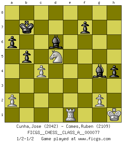 Last move : 1/2-1/2 2010 October 8 10:32:36 [Event "FICGS__CHESS__CLASS_A__000077"] [Site "FICGS"] [Date "2010.09.18"] [Round "1"] [White "Cunha,Jose"] [Black "Comes,Ruben"] [Result "1/2-1/2"] [WhiteElo "2042"] [BlackElo "2109"] 1.e4 c5 2.Nf3 d6 3.d4 cxd4 4.Nxd4 Nf6 5.Nc3 a6 6.Bg5 e6 7.f4 Qb6 8.Qd2 Qxb2 9.Rb1 Qa3 10.e5 h6 11.Bh4 dxe5 12.fxe5 g5 13.exf6 gxh4 14.Be2 Qa5 15.O-O Nd7 16.Kh1 Qg5 17.Rf4 e5 18.Nd5 exd4 19.Qxd4 Bc5 20.Qe4+ Kd8 21.Rf5 Re8 22.Qxe8+ Kxe8 23.Rxg5 hxg5 24.Nc7+ Kd8 25.Nxa8 Nxf6 26.Bf3 b5 27.Rd1+ Ke7 28.h3 Bd7 29.Nc7 Bd6 30.Na8 Bc5 31.Nc7 Bd6 32.Re1+ Kd8 33.Na8 g4 34.hxg4 Nxg4 35.Nb6 Be6 36.Nd5 Kc8 37.Bxg4 Bxg4 38.c4 Kb7 1/2-1/2 Sicilian : Najdorf, 7...Qb6 Kingside Castling by player White (move 15) This chess game ended in a draw. Follow this game move after move (download)We don't really know how the game was invented, though there are suspicions. As soon as we discover the culprits, we'll let you know. (Bruce Pandolfini) Ich verstehe mehr vom Schach als irgendein anderer lebender Meister. (José Raúl Capablanca) ¿Esta Bobby Fischer algo cuerdo?. (Salo Flohr) Dans le domaine de la peinture, de la gravure et de la sculpture, dès la première décennie de notre siècle, les artistes abandonnent la représentation de la partie d'échecs pour se concentrer sur les pièces, sur les échiquiers et sur toutes les variations auxquelles les unes et les autres peuvent donner lieu. On passe en quelque sorte d'un thème social à un thème musical (au sens de la musica médiévale, c'est-à-dire d'une notion qui inclue le rythme, l'harmonie, la construction et la déconstruction, etc.). Graphiquement et picturalement, l'échiquier apparaît comme une structure ouverte, dynamique, d'une richesse infinie, autorisant toutes les combinatoires et débouchant sur des mouvements et des rythmes de nature exponentielle. (Michel Pastoureau) When you stop learning you start dying. (M. Scott Adams)