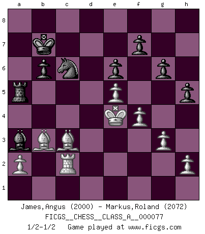 Last move : 1/2-1/2 2011 February 2 6:50:53 [Event "FICGS__CHESS__CLASS_A__000077"] [Site "FICGS"] [Date "2010.09.18"] [Round "1"] [White "James,Angus"] [Black "Markus,Roland"] [Result "1/2-1/2"] [WhiteElo "2000"] [BlackElo "2072"] 1.e4 c6 2.d4 d5 3.e5 Bf5 4.Nf3 e6 5.Be2 c5 6.Be3 cxd4 7.Nxd4 Ne7 8.c4 Nbc6 9.Qa4 dxc4 10.Na3 Qa5+ 11.Qxa5 Nxa5 12.Nxc4 Nxc4 13.Bxc4 a6 14.O-O Be4 15.Rac1 Bd5 16.Be2 Rc8 17.b4 Rxc1 18.Rxc1 Kd7 19.b5 axb5 20.Nxb5 Bc6 21.Nc3 Ng6 22.f4 Bb4 23.Rd1+ Kc8 24.Nb5 Bxb5 25.Bxb5 Ne7 26.Bc4 Kc7 27.Rc1 Nc6 28.Kf2 Ra8 29.Kf3 Ra5 30.Bb3 b6 31.Bd4 Ba3 32.Rc2 h5 33.Ke4 g6 34.g3 Kb7 35.Bc3 1/2-1/2 Caro-Kann : Advance variation Kingside Castling by player White (move 14) This chess game ended in a draw. Follow this game move after move (download)All I want to do, ever, is just play Chess. (Bobby Fischer) Fischer ist das größte Genie, das je vom Schachhimmel heruntergestiegen ist. (Mikhail Nekhemyevich Tal) Alguna parte de un error es siempre correcto. (Savielly Tartakover) Je crois qu'il existe des manières très spécifiques de jouer efficacement contre une machine. Evidemment, nous n'avons aucune chance en technique pure, parce que l'ordinateur calcule de manière parfaite. Mais lorsque nous faisons appel à notre cerveau, en utilisant l'intuition et la compréhension, alors nous restons beaucoup plus forts. (Anatoli Karpov) Question: Is 'This statement is paradoxical' a paradoxical statement ? Or is it a meta-paradox ? (Normajean Yates)