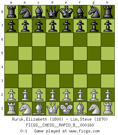 Last move : 0-1 2010 October 18 22:1:4 [Event "FICGS__CHESS__RAPID_B__000160"] [Site "FICGS"] [Date "2010.09.18"] [Round "1"] [White "Ruruk,Elizabeth"] [Black "Lim,Steve"] [Result "0-1"] [WhiteElo "1800"] [BlackElo "1870"] 0-1 This chess game has been lost on time (started : 2010.09.18 18:36:52) Player Black won this chess game. Follow this game move after move (download)I have never in my life played the French Defence, which is the dullest of all openings. (Wilhelm Steinitz) Dass jemand wie Surab Asmaiparaschwili, der selbst Elopunkte gekauft hat , Vize-Präsident der Fide werden konnte, sagt schon einges über den Zustand dieser Organisation aus. (Joel Lautier) Vive, pierde y aprende al observar a tu oponente como gana. (Amber Steenbock) Roi des jeux et jeu des rois, les échecs portent en eux un sentiment d'infini. Ils donnent à celui qui s'est efforcé d'en approfondir les arcanes l'impression de n'être pas à la mesure de l'homme; en fait, ils constituent un résumé de l'univers, un microcosme, et figurent cette grande échelle qui, dans les plans de la lumière descend jusqu'à la matière, qui des abîmes insondables remonte jusqu'en l'infini de Dieu. (Pyrame) It's not a bug - it's an undocumented feature. (Anonymous)