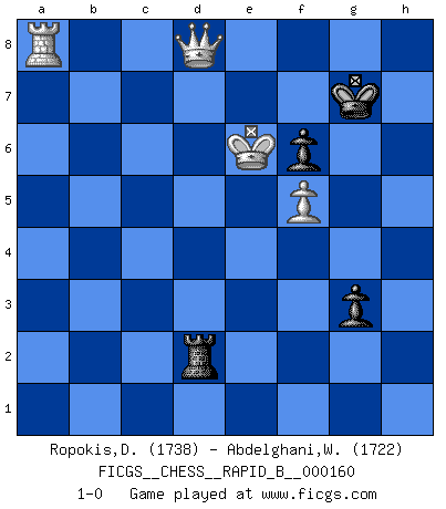 Last move : 1-0 2010 September 26 13:26:13 [Event "FICGS__CHESS__RAPID_B__000160"] [Site "FICGS"] [Date "2010.09.18"] [Round "1"] [White "Ropokis,Dimitrios"] [Black "Abdelghani,Wael"] [Result "1-0"] [WhiteElo "1738"] [BlackElo "1722"] 1.e4 c5 2.Nc3 a6 3.f4 b5 4.a3 Bb7 5.d3 e6 6.Be2 d5 7.exd5 exd5 8.Nf3 Nf6 9.d4 b4 10.Na4 Nbd7 11.dxc5 Nxc5 12.Nxc5 Bxc5 13.axb4 Bxb4+ 14.c3 Be7 15.Qa4+ Qd7 16.Qxd7+ Nxd7 17.Be3 O-O 18.O-O Rfe8 19.Rfe1 Nc5 20.Bf1 Nb3 21.Rad1 Bf6 22.Bf2 a5 23.Bb5 Rxe1+ 24.Rxe1 d4 25.Nxd4 Nxd4 26.Bxd4 Bxd4+ 27.cxd4 Kf8 28.g3 Rd8 29.Kf2 f6 30.Ke3 Ke7 31.Ra1 Ra8 32.Bd3 g6 33.f5 g5 34.Be4 Bxe4 35.Kxe4 Kd6 36.g4 a4 37.h3 Ra7 38.Ra3 Re7+ 39.Kd3 Rb7 40.Rxa4 Rxb2 41.Ra7 Rb3+ 42.Ke4 Rxh3 43.Ra6+ Ke7 44.Kd5 h5 45.Ra7+ Kf8 46.gxh5 g4 47.Ke6 Rxh5 48.d5 g3 49.d6 Rh2 50.d7 Rd2 51.Ra8+ Kg7 52.d8Q 1-0 Sicilian : Closed Kingside Castling by player Black (move 17) Kingside Castling by player White (move 18) 10 pieces endgame at move 42 : White KRPPP , Black KRPPP WHITE : King + 1 Rook 3 Pawns BLACK : King + 1 Rook 3 Pawns 9 pieces endgame at move 46 : White KRPPP , Black KRPP WHITE : King + 1 Rook 3 Pawns BLACK : King + 1 Rook 2 Pawns 8 pieces endgame at move 47 : White KRPP , Black KRPP WHITE : King + 1 Rook 2 Pawns BLACK : King + 1 Rook 2 Pawns Promotion Queen by player White (move 52) Player White won this chess game. Follow this game move after move (download)He who fears an isolated Queen's Pawn should give up Chess. (Siegbert Tarrasch) Das Zentrum ist der Balkan des Schachbretts - Kriegshandlungen können in jedem Moment ausbrechen. (Aaron Nimzowitsch) Aún el Rey más flojo huye despavorido ante la amenaza de un Jaque doble. (Aaron Nimzowitsch) Il s'avisa de me proposer d'apprendre les échecs qu'il jouait un peu... me voilà forcené des échecs. J'achète un échiquier, je m'enferme dans ma chambre, j'y passe des jours et des nuits à vouloir apprendre par cur toutes les parties. (Jean-Jacques Rousseau, Confessions) Follow your passion, and success will follow you. (Arthur Buddhold)