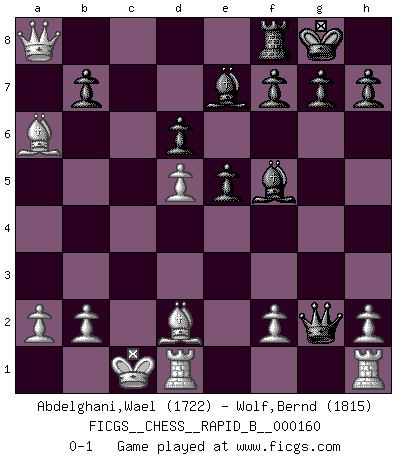Last move : 0-1 2010 September 26 1:25:36 [Event "FICGS__CHESS__RAPID_B__000160"] [Site "FICGS"] [Date "2010.09.18"] [Round "1"] [White "Abdelghani,Wael"] [Black "Wolf,Bernd"] [Result "0-1"] [WhiteElo "1722"] [BlackElo "1815"] 1.e4 c5 2.Nf3 Nc6 3.d4 cxd4 4.Nxd4 Nf6 5.Nc3 e5 6.Ndb5 d6 7.Nd5 Nxd5 8.exd5 Nb8 9.Qf3 a6 10.Qa3 Be7 11.Bd2 O-O 12.Bb4 Qd7 13.c4 axb5 14.Qxa8 Na6 15.Bd2 bxc4 16.Bxc4 Qg4 17.Bxa6 Qxg2 18.O-O-O Bf5 0-1 Sicilian : Pelikan (Lasker/Sveshnikov) variation Kingside Castling by player Black (move 11) Queenside Castling by player White (move 18) Player Black won this chess game. Follow this game move after move (download)If a ruler does not understand Chess, how can he rule over a kingdom ? (King Khusros II) Ein Remis kann durch Wiederholung von drei Zügen oder durch einen schlechte Zug erreicht werden. (Savielly Grigorievitsch Tartakower) Yo siempre he tenido un ligero sentimiento de lástima por una persona que no tiene conocimiento del Ajedrez. (Siegbert Tarrasch) Aux échecs, les retours au sommet sont rares : les dommages psychologiques consécutifs à une défaite sont trop sévères. (Daily Telegraph) Cactus - It is depressed cucumber. (Ilmars Cirulis)