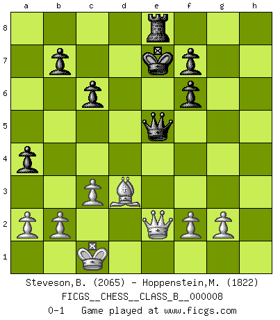 Last move : 0-1 2006 December 30 4:35:22 [Event "FICGS__CHESS__CLASS_B__000008"] [Site "FICGS"] [Date "2006.11.22"] [Round "1"] [White "Steveson,Brian"] [Black "Hoppenstein,Michael"] [Result "0-1"] [WhiteElo "2065"] [BlackElo "1822"] 1.e4 c6 2.d4 d5 3.Nc3 dxe4 4.Nxe4 Nf6 5.Nxf6+ exf6 6.c3 Bd6 7.Bd3 O-O 8.Qc2 Re8+ 9.Ne2 g6 10.h4 Nd7 11.h5 Nf8 12.Be3 a5 13.O-O-O a4 14.Nf4 Qc7 15.Nxg6 hxg6 16.hxg6 Bg4 17.g7 Kxg7 18.Bh6+ Kg8 19.Bxf8 Bxd1 20.Qxd1 Kxf8 21.Rh8+ Ke7 22.Qe2+ Be5 23.Rxe8+ Rxe8 24.dxe5 Qxe5 0-1 Caro-Kann : Tartakower (Nimzovich) variation Kingside Castling by player Black (move 7) Queenside Castling by player White (move 13) Player Black won this chess game. Follow this game move after move (download)There just isn't enough televised Chess. (David Letterman) Kein Großmeister ist normal. Sie unterscheiden sich nur im Ausmaß Ihrer Verrücktheit. (Viktor Kortschnoi) La táctica fluye a partir de una posición superior. (Bobby Fischer) Demandez au pauvre Cg1 ce qu'il en pense. Eduard Gufeld à propos de la variante Saemisch de l'Est-Indienne. As the days dwindle down... to a precious few. (Maxwell Anderson)