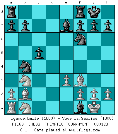 Last move : 0-1 2010 September 26 12:0:41 [Event "FICGS__CHESS__THEMATIC_TOURNAMENT__000123"] [Site "FICGS"] [Date "2010.09.18"] [Round "1"] [White "Trigance,Emile"] [Black "Voveris,Saulius"] [Result "0-1"] [WhiteElo "1600"] [BlackElo "1800"] 1.b4 c5 2.bxc5 e5 3.Bb2 Nc6 4.Nf3 e4 5.Nd4 Nf6 6.Nb3 d6 7.e3 dxc5 8.c4 Be7 9.Be2 O-O 10.O-O Be6 11.d4 exd3 12.Bxd3 Nb4 13.Be2 Qxd1 14.Bxd1 Bxc4 15.Bf3 Bxf1 0-1 Polish (Sokolsky) opening Kingside Castling by player Black (move 9) Kingside Castling by player White (move 10) Player Black won this chess game. Follow this game move after move (download)The Chess pieces are the block alphabet which shapes thoughts; and these thoughts, although making a visual design on the chessboard, express their beauty abstractly, like a poem. (Marcel Duchamp) Aljechin war kein Nazi. Er war ein Opportunist. Ein schrecklicher Mann. Er liebte Geld über alles und würde für Geld ein Jude, ein Katolik oder ein Protestant werden. (Miguel Najdorf) La maestría del Ajedrez consiste esencialmente en analizar posiciónes de Ajedrez con precisión. (Mikhail Botvinnik) Karpov est une pièce de musée. (Garry Kasparov) Games, world of games... There's always an opponent, and there's always a victim. (Revolver, movie)