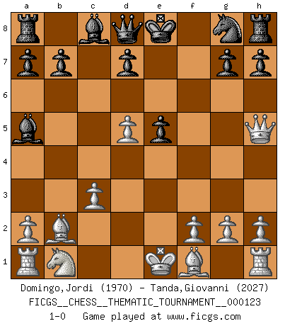Last move : 1-0 2010 October 29 15:10:3 [Event "FICGS__CHESS__THEMATIC_TOURNAMENT__000123"] [Site "FICGS"] [Date "2010.09.18"] [Round "1"] [White "Domingo,Jordi"] [Black "Tanda,Giovanni"] [Result "1-0"] [WhiteElo "1970"] [BlackElo "2027"] 1.b4 c5 2.bxc5 e5 3.Bb2 Nc6 4.Nf3 f6 5.e3 Bxc5 6.d4 exd4 7.exd4 Bb4+ 8.c3 Ba5 9.d5 Ne5 10.Nxe5 fxe5 11.Qh5+ 1-0 Polish (Sokolsky) opening Player White won this chess game. Follow this game move after move (download)Alekhine is a poet who creates a work of art out of something that would hardly inspire another man to send home a picture post card. (Max Euwe) Wenn ich mich einlogge, glauben die Leute gewöhnlich nicht, dass ich es selbst bin und sie fangen an, mir dumme Fragen zu stellen. Und wenn sie es glauben, stellen sie wieder andere dumme Fragen. (Judith Polgar) El Ajedrez es una guerra en un tablero. El objetivo es aplastar la mente del oponente. (Bobby Fischer) Donnez-moi un Cavalier en 6e et je gagnerais toutes mes parties. (Steinitz) Luck never gives; it only lends. (Swedish proverb)