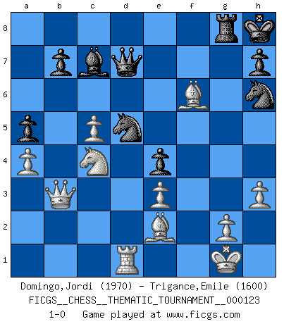 Last move : 1-0 2010 October 12 19:48:3 [Event "FICGS__CHESS__THEMATIC_TOURNAMENT__000123"] [Site "FICGS"] [Date "2010.09.18"] [Round "1"] [White "Domingo,Jordi"] [Black "Trigance,Emile"] [Result "1-0"] [WhiteElo "1970"] [BlackElo "1600"] 1.b4 c5 2.bxc5 e5 3.Bb2 Nc6 4.Nf3 e4 5.Nd4 Nf6 6.Nb3 a5 7.a4 d5 8.e3 Be7 9.h3 Bd7 10.d4 O-O 11.Nc3 Be6 12.Rb1 Kh8 13.Be2 Ng8 14.Nb5 f5 15.O-O Qd7 16.c4 Rf6 17.cxd5 Bxd5 18.Nd2 Nh6 19.Nc3 Nb4 20.Nxd5 Nxd5 21.Qb3 Nb4 22.Nc4 Bd8 23.f3 Bc7 24.fxe4 fxe4 25.Rxf6 gxf6 26.d5 Nxd5 27.Rd1 Rg8 28.Bxf6+ 1-0 Polish (Sokolsky) opening Kingside Castling by player Black (move 10) Kingside Castling by player White (move 15) Player White won this chess game. Follow this game move after move (download)There's never before been a Chess player with such a thorough knowledge of the intricacies of the game and such an absolutely indomitable will to win. I think Bobby is the greatest player that ever lived. (Lisa Lane) Herr Iljumschinow ist ein etwas merkwürdiger Geschäftsmann: Er arbeitet zusammen mit Leuten wie Muammar al-Gaddafi; früher ist das Saddam Hussein gewesen. (Joel Lautier) Dios mío, Bobby Fischer juega tan simple. (Alexei Suetin) Il (Jacob Murray) ne joue pas pour le bon coup, mais pour le meilleur. (Eloi Relange) A person who never made a mistake never tried anything new. (Albert Einstein)