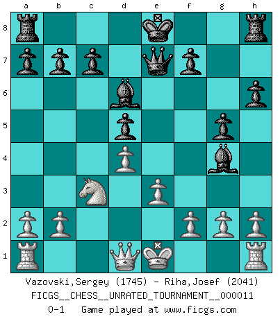 Last move : 0-1 2010 December 8 22:25:52 [Event "FICGS__CHESS__UNRATED_TOURNAMENT__000011"] [Site "FICGS"] [Date "2010.09.18"] [Round "1"] [White "Vazovski,Sergey"] [Black "Riha,Josef"] [Result "0-1"] [WhiteElo "1745"] [BlackElo "2041"] 1.d4 e6 2.c4 d5 3.Nc3 h6 4.Nf3 Nf6 5.Bf4 g5 6.Be5 Nbd7 7.cxd5 Nxe5 8.Nxe5 exd5 9.e3 Bd6 10.Be2 Qe7 11.Ng4 Nxg4 12.Bxg4 Bxg4 0-1 This chess game has been lost on time (started : 2010.09.18 18:59:3) Queen's pawn Player Black won this chess game. Follow this game move after move (download)You cannot play at Chess if you are kind-hearted. (French Proverb) Ich war schon mal beim Dopingtest. Da musste ich Urin abgeben, während Dritte zusahen. (Elisabeth Pähtz) El Ajedrez es una guerra en un tablero. El objetivo es aplastar la mente del oponente. (Bobby Fischer) Le moment que je préfère le plus dans une rencontre, c'est celui où je sens que la personnalité de l'adversaire se brise. (Robert Fischer) It's not the size of the dog in the fight, it's the size of the fight in the dog. (Mark Twain)