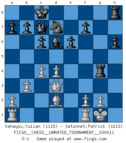 Last move : 0-1 2010 December 14 10:15:25 [Event "FICGS__CHESS__UNRATED_TOURNAMENT__000011"] [Site "FICGS"] [Date "2010.09.18"] [Round "1"] [White "Kehayov,Yulian"] [Black "Satonnet,Patrick"] [Result "0-1"] [WhiteElo "1115"] [BlackElo "1613"] 1.e4 d5 2.exd5 Qxd5 3.Nc3 Qa5 4.Nf3 Nf6 5.d4 c6 6.Bd2 Bf5 7.Nd5 Qxd5 8.Be2 e6 9.O-O Be7 10.c4 Qd8 11.Bg5 h6 12.Be3 Qc7 13.Nh4 Bh7 14.Bd3 Bxd3 15.Qxd3 Nbd7 16.b3 O-O-O 17.h3 g5 18.Nf3 Rdg8 19.Bd2 g4 20.Nh2 Bd6 21.Nxg4 Nxg4 22.hxg4 Rxg4 0-1 Scandinavian (centre counter) defense Kingside Castling by player White (move 9) Queenside Castling by player Black (move 16) Player Black won this chess game. Follow this game move after move (download)We must make sure that Chess will not be like a dead language, very interesting, but for a very small group. (Sytze Faber) Wie ich sie so einen nach dem anderen nieder mähte wurde meine Überlegenheit offensichtlich. (José Raúl Capablanca) Cuando tu no sabes absolutamente que mas hacer, es tiempo de entrar en pánico. (John van der Wiel) D'abord les bases : Jouez et étudiez, puis étudiez et jouez, ensuite jouez et étudiez, puis étudiez et jouez. Deuxièmement : Donnez toujours le meilleur de vous-même ! (Ken Smith) To err is human, but to really foul things up requires a computer. (Farmer's Almanac, 1978)