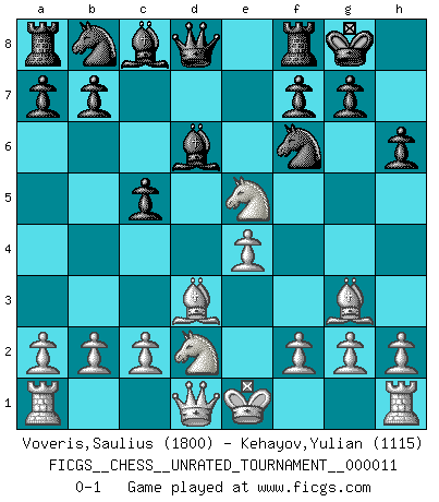 Last move : 0-1 2010 November 27 22:49:12 [Event "FICGS__CHESS__UNRATED_TOURNAMENT__000011"] [Site "FICGS"] [Date "2010.09.18"] [Round "1"] [White "Voveris,Saulius"] [Black "Kehayov,Yulian"] [Result "0-1"] [WhiteElo "1800"] [BlackElo "1115"] 1.d4 Nf6 2.Bg5 e6 3.Nf3 Be7 4.Nbd2 O-O 5.e4 h6 6.Bh4 d6 7.Bd3 e5 8.dxe5 dxe5 9.Bg3 c5 10.Nxe5 Bd6 0-1 Trompowsky attack (Ruth, Opovcensky Opening) Kingside Castling by player Black (move 4) Player Black won this chess game. Follow this game move after move (download)Best by test: 1. e4 (Bobby Fischer) Was ist der Unterschied zwischen einem Strassenarbeiter und einem Schachspieler? --Der Schachspieler bewegt sich ab und zu. (Anonymous) Dios mío, Bobby Fischer juega tan simple. (Alexei Suetin) Les Echecs sont affaire de jugement sensible. Savoir quand frapper et quand esquiver. (Fischer) All the biggest technological inventions created by man - the airplane, the automobile, the computer - says little about his intelligence, but speaks volumes about his laziness. (Mark Kennedy)