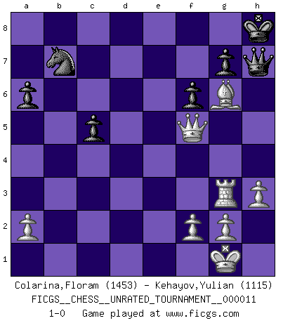 Last move : 1-0 2010 November 5 20:23:23 [Event "FICGS__CHESS__UNRATED_TOURNAMENT__000011"] [Site "FICGS"] [Date "2010.09.18"] [Round "1"] [White "Colarina,Floram"] [Black "Kehayov,Yulian"] [Result "1-0"] [WhiteElo "1453"] [BlackElo "1115"] 1.d4 d5 2.Nf3 e6 3.c4 Nf6 4.Bg5 Be7 5.e3 O-O 6.Nc3 Ne4 7.Bxe7 Qxe7 8.Bd3 Nxc3 9.bxc3 dxc4 10.Bxc4 Nc6 11.O-O e5 12.h3 exd4 13.exd4 Qf6 14.Re1 Bd7 15.Rb1 b6 16.Bb5 a6 17.Bc4 Na5 18.Bd5 Rab8 19.Qc2 c5 20.dxc5 bxc5 21.Ne5 Bf5 22.Be4 Rxb1 23.Qxb1 Qxe5 24.Bxf5 Qxc3 25.Bxh7+ Kh8 26.Re3 Qf6 27.Rf3 Qh6 28.Bg6 f6 29.Qf5 Nb7 30.Rg3 Re8 31.Bxe8 Qh7 32.Bg6 1-0 Queen's pawn game Kingside Castling by player Black (move 5) Kingside Castling by player White (move 11) Player White won this chess game. Follow this game move after move (download)I feel as if I were a piece in a game of Chess, when my opponent says of it: That piece cannot be moved. (Soren Kierkegaard) Das Schach hält seine Meister in eigenen Banden, Fesseln; auf vielerlei Weise formt es ihren Geist, so dass die innere Freiheit selbst des Stärksten beeinflusst wird. (Albert Einstein) Aquel que ve no otra dirección en el juego que la de dar Jaque Mate a su oponente, nunca será un buen jugador de Ajedrez. (Euwe) Il n'y a pas de prix trop élevé au scalp de l'ennemi. (Koblentz) Art disturbs, science reassures. (Georges Braque, Le Jour et la Nuit)