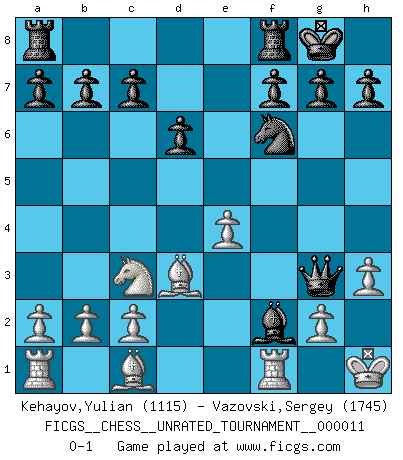 Last move : 0-1 2010 October 7 21:19:59 [Event "FICGS__CHESS__UNRATED_TOURNAMENT__000011"] [Site "FICGS"] [Date "2010.09.18"] [Round "1"] [White "Kehayov,Yulian"] [Black "Vazovski,Sergey"] [Result "0-1"] [WhiteElo "1115"] [BlackElo "1745"] 1.e4 e5 2.d4 exd4 3.Qxd4 Nc6 4.Qd1 Nf6 5.Bd3 Bc5 6.Nf3 O-O 7.O-O d6 8.Qe2 Bg4 9.h3 Nd4 10.Qd1 Nxf3+ 11.Kh1 Nh2 12.Kxh2 Bxd1 13.Rxd1 Bxf2 14.Nc3 Qe7 15.Rf1 Qe5+ 16.Kh1 Qg3 0-1 Centre game Kingside Castling by player Black (move 6) Kingside Castling by player White (move 7) Player Black won this chess game. Follow this game move after move (download)Via the squares on the chessboard, the Indians explain the movement of time and the age, the higher influences which control the world and the ties which link Chess with the human soul. (Al-Masudi) Charakterschwächen offenbaren sich normalerweise während einer Schachpartie. (Garry Kasparov) Debes de llevar a tu oponente hacia un profundo y obscuro bosque donde 2+2=5, y el camino que conduce a la salida es suficientemente ancho para solamente uno. (Mikhail Tal) Les Echecs représentent une sphère d'idées créatrices basée sur la volonté des deux protagonistes. (Smyslov) Waiting for chance ? Play in casinos. (FICGS proverb)
