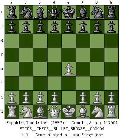 Last move : 1-0 2010 September 18 21:1:42 [Event "FICGS__CHESS__BULLET_BRONZE__000404"] [Site "FICGS"] [Date "2010.09.18"] [Round "1"] [White "Ropokis,Dimitrios"] [Black "Gawali,Vijay"] [Result "1-0"] [WhiteElo "1857"] [BlackElo "1700"] 1.e4 1-0 This chess game has been lost on time (started : 2010.09.18 20:20:47) King's pawn Opening Player White won this chess game. Follow this game move after move (download)Mistrust is the most necessary characteristic of the Chess player. (Siegbert Tarrasch) Im Spitzenschach von heute geht es nur um Vorbereitung, um tiefgründige, sorgfältige Eröffnungsvorbereitung. (Nigel Short) Los Peones son nacidos libres, y aún así, se encuentran por doquier encadenados. (Rick Kennedy) Dieu déplace le joueur, et celui-ci la pièce. Quel Dieu derrière Dieu commence donc la trame ? Arturo Perez-Reverte (prix de littérature policière 1993). Over-the-board chess is the favorite of mortals, correspondence chess is the favorite of the gods. (Eduard Dyckhoff)
