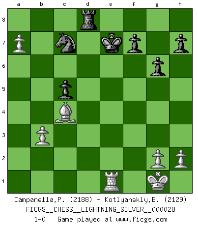 Last move : 1-0 2010 September 18 22:5:0 [Event "FICGS__CHESS__LIGHTNING_SILVER__000028"] [Site "FICGS"] [Date "2010.09.18"] [Round "1"] [White "Campanella,Paul"] [Black "Kotlyanskiy,Edward"] [Result "1-0"] [WhiteElo "2188"] [BlackElo "2129"] 1.e4 c5 2.Nc3 a6 3.Nf3 e6 4.d4 cxd4 5.Nxd4 Nc6 6.Be2 Qc7 7.O-O Nf6 8.Be3 Bb4 9.Na4 Be7 10.Nxc6 bxc6 11.Nb6 Rb8 12.Nxc8 Qxc8 13.Bd4 Qc7 14.e5 Nd5 15.b3 c5 16.Bb2 a5 17.Qd2 Nb4 18.f4 a4 19.Bc4 Nc6 20.Rad1 Rb7 21.Bc3 axb3 22.cxb3 O-O 23.Kh1 g6 24.f5 Rd8 25.Qf4 d5 26.exd6 Bxd6 27.Qh4 Be7 28.Rxd8+ Nxd8 29.Qh6 Bf8 30.Qe3 exf5 31.Rxf5 Qe7 32.Re5 Qd7 33.Rd5 Qc7 34.a4 Ne6 35.a5 Bg7 36.Bxg7 Kxg7 37.a6 Rb8 38.Qg3 Re8 39.Qxc7 Nxc7 40.Rd1 Kf8 41.Kg1 Ke7 42.a7 Ra8 43.Ra1 Rd8 44.Re1+ 1-0 Sicilian : Closed Kingside Castling by player White (move 7) Kingside Castling by player Black (move 22) Player White won this chess game. Follow this game move after move (download)If a ruler does not understand Chess, how can he rule over a kingdom ? (King Khusros II) Ein Remis kann durch Wiederholung von drei Zügen oder durch einen schlechte Zug erreicht werden. (Savielly Grigorievitsch Tartakower) El estómago es una parte esencial del maestro de Ajedrez. (Bent Larsen) Les échecs c'est le défi de l'alpiniste, toujours plus haut, prêt à tout pour monter à l'assaut du Roi ennemi. Les échecs, c'est de la musique en mouvement, un ballet majestueux pour les yeux. C'est de la poésie composée par les fantômes du passé qui au même titre que Rimbaud ou Verlaine méritent notre admiration. Les échecs, c'est de la peinture ou le moindre mouvement modifie le tableau pour en faire un Picasso ou un Van Gogh. Les échecs, c'est tout et rien, c'est la vie et la mort. Jjulie33 sur le forum de France-Echecs. Treat your password like your toothbrush. Don't let anybody else use it, and get a new one every six months. (Clifford Stoll)