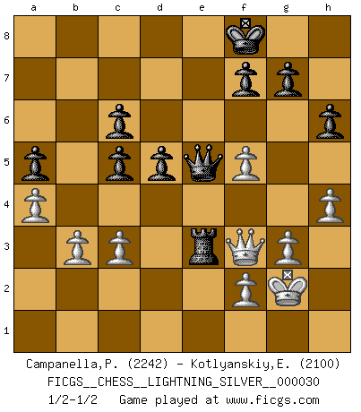 Last move : 1/2-1/2 2010 September 19 20:57:11 [Event "FICGS__CHESS__LIGHTNING_SILVER__000030"] [Site "FICGS"] [Date "2010.09.19"] [Round "1"] [White "Campanella,Paul"] [Black "Kotlyanskiy,Edward"] [Result "1/2-1/2"] [WhiteElo "2242"] [BlackElo "2100"] 1.e4 e5 2.Nf3 Nc6 3.Bb5 Bc5 4.c3 Nf6 5.O-O O-O 6.d4 Bb6 7.Bg5 h6 8.Bh4 d6 9.a4 a5 10.Re1 exd4 11.Bxc6 bxc6 12.Nxd4 Re8 13.Nf5 Bxf5 14.exf5 Rxe1+ 15.Qxe1 d5 16.Nd2 Qd6 17.Bg3 Qd7 18.Qb1 Re8 19.Qd3 Ne4 20.Nxe4 Rxe4 21.Qf3 Qd8 22.h4 Bc5 23.b3 Bd6 24.Bxd6 Qxd6 25.g3 Qe5 26.Rd1 c5 27.Rd3 Kf8 28.Kg2 c6 29.Re3 Rxe3 1/2-1/2 Ruy Lopez : Classical defense, Benelux variation Kingside Castling by player White (move 5) Kingside Castling by player Black (move 5) This chess game ended in a draw. Follow this game move after move (download)The sign of a great Master is his ability to win a won game quickly and painlessly. (Irving Chernev) Deine Wertungszahl - vorausgesetzt einige Jahre schachliche Anstrengung - entspricht etwa dem zehnfachen Deines IQ plus 1000. (Jonathan Levitt) Hoy en día, si tu no eres un Gran Maestro a los 14 años, es mejor que lo olvides. (Anand Viswanathan) Pour moi, les échecs ne sont pas un jeu mais un art. (Alexandre Alekhine) Wisdom begins at the end. (Daniel Webster)