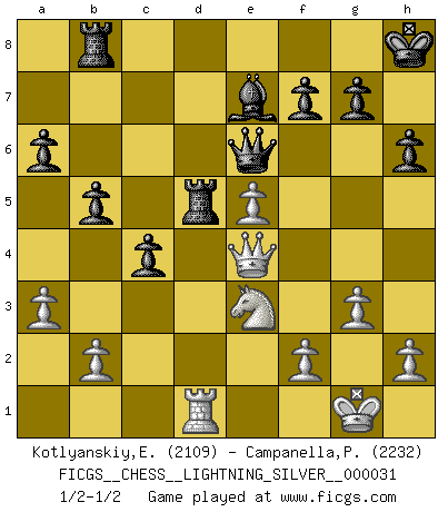 Last move : 1/2-1/2 2010 September 19 21:32:43 [Event "FICGS__CHESS__LIGHTNING_SILVER__000031"] [Site "FICGS"] [Date "2010.09.19"] [Round "1"] [White "Kotlyanskiy,Edward"] [Black "Campanella,Paul"] [Result "1/2-1/2"] [WhiteElo "2109"] [BlackElo "2232"] 1.d4 Nf6 2.c4 e6 3.g3 d5 4.Bg2 Be7 5.Nf3 O-O 6.O-O dxc4 7.Qc2 a6 8.Qxc4 b5 9.Qc2 Bb7 10.Bd2 Be4 11.Qc1 Bb7 12.Bf4 Bd6 13.Nc3 Nbd7 14.Rd1 Nb6 15.a3 Rc8 16.Bg5 h6 17.Bh4 Kh8 18.e4 Be7 19.Bxf6 Bxf6 20.e5 Be7 21.Qc2 Rb8 22.Ne1 Qc8 23.d5 Nxd5 24.Nxd5 Bxd5 25.Bxd5 exd5 26.Rxd5 c5 27.Rad1 c4 28.Ng2 Rd8 29.Ne3 Qe6 30.Qe4 Rxd5 1/2-1/2 Catalan : Closed, 5.Nf3 Kingside Castling by player Black (move 5) Kingside Castling by player White (move 6) This chess game ended in a draw. Follow this game move after move (download)Chess is above all, a fight ! (Emanuel Lasker) Ein Kibitz ist einer, der deinem Gegner gute Ratschläge gibt. (Andrew Soltis) Aquellos que dicen entender al Ajedrez, no entienden nada. (Robert Hubner) Le génie consiste à savoir transgresser les règles au moment opportun. (Teichmann) The large trees attract high winds. (Chinese proverb)