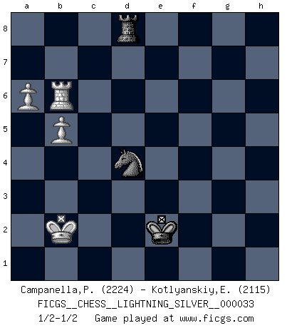 Last move : 1/2-1/2 2010 September 19 22:28:25 [Event "FICGS__CHESS__LIGHTNING_SILVER__000033"] [Site "FICGS"] [Date "2010.09.19"] [Round "1"] [White "Campanella,Paul"] [Black "Kotlyanskiy,Edward"] [Result "1/2-1/2"] [WhiteElo "2224"] [BlackElo "2115"] 1.e4 c5 2.Nf3 d6 3.d4 cxd4 4.Nxd4 Nf6 5.Nc3 a6 6.Be3 e5 7.Nb3 Be6 8.f3 Be7 9.Qd2 O-O 10.O-O-O Qc7 11.Kb1 Nbd7 12.Qf2 b5 13.g4 Rfc8 14.g5 Nh5 15.h4 b4 16.Nd5 Bxd5 17.Rxd5 a5 18.Bh3 a4 19.Nc1 Rcb8 20.Bg4 g6 21.Bxh5 gxh5 22.Nd3 Qb7 23.Rc1 f5 24.Qg2 b3 25.cxb3 axb3 26.a3 Rc8 27.Qe2 fxe4 28.fxe4 Qa6 29.Qxh5 Rc2 30.g6 Nf6 31.Qf5 Kh8 32.Rg1 Qc8 33.Qxc8+ Raxc8 34.Rb5 Nxe4 35.Rxb3 h5 36.a4 Kg7 37.Rb7 R2c7 38.Rc1 Rxb7 39.Rxc8 Nf6 40.a5 Nd5 41.a6 Rc7 42.Rb8 Nxe3 43.Rb7 Rc8 44.Rxe7+ Kxg6 45.Re6+ Kf5 46.Rxd6 e4 47.Nb4 Ng2 48.Rd5+ Kf4 49.Rg5 Nxh4 50.Rxh5 Nf3 51.Nd5+ Kg3 52.b4 Nd4 53.Rh7 Ra8 54.Rh6 Rd8 55.Rb6 Kf3 56.Kb2 e3 57.Nc3 e2 58.Nxe2 Kxe2 59.b5 1/2-1/2 Sicilian : Najdorf, Byrne (English) attack Kingside Castling by player Black (move 9) Queenside Castling by player White (move 10) 10 pieces endgame at move 49 : White KRNPP , Black KRNPP WHITE : King + 1 Rook 1 Knight 2 Pawns BLACK : King + 1 Rook 1 Knight 2 Pawns 9 pieces endgame at move 50 : White KRNPP , Black KRNP WHITE : King + 1 Rook 1 Knight 2 Pawns BLACK : King + 1 Rook 1 Knight 1 Pawn 8 pieces endgame at move 58 : White KRNPP , Black KRN WHITE : King + 1 Rook 1 Knight 2 Pawns BLACK : King + 1 Rook 1 Knight 7 pieces endgame at move 58 : White KRPP , Black KRN WHITE : King + 1 Rook 2 Pawns BLACK : King + 1 Rook 1 Knight This chess game ended in a draw. Follow this game move after move (download)When you absolutely don't know what to do anymore, it is time to panic. (John van der Wiel) Mutter, ich bin eben Ex-Weltmeister geworden. --beim nach Hause Kommen nach dem Verlust des WM-Titels an Mihail Botvinnik -- (Mikhail Nekhemyevich Tal) Cuando estes solo, cuando te sientas un extraño en el mundo, juega al Ajedrez. Esto levantará tu espiritu y será tu consejero de guerra. (Aristóteles) Il (Jacob Murray) ne joue pas pour le bon coup, mais pour le meilleur. (Eloi Relange) Man is reluctant to give credit for intelligence to anyone, except his enemies. (Albert Einstein)