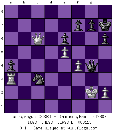 Last move : 0-1 2010 December 7 14:58:55 [Event "FICGS__CHESS__CLASS_B__000125"] [Site "FICGS"] [Date "2010.09.20"] [Round "1"] [White "James,Angus"] [Black "Germanes,Ramil"] [Result "0-1"] [WhiteElo "2000"] [BlackElo "1980"] 1.e4 c5 2.Nf3 d6 3.d4 cxd4 4.Nxd4 Nf6 5.Nc3 a6 6.Bc4 e6 7.O-O b5 8.Bb3 Be7 9.Qf3 Qb6 10.Be3 Qb7 11.Qg3 b4 12.Na4 Nbd7 13.f3 O-O 14.Rfd1 Ne5 15.a3 bxa3 16.Rxa3 Bd7 17.Nb6 Nh5 18.Qh3 Qxb6 19.Qxh5 Qb7 20.Bg5 Bxg5 21.Qxg5 a5 22.f4 h6 23.Qg3 Nc6 24.Ne2 Ne7 25.Qd3 a4 26.Ba2 Bc6 27.Ng3 Qxb2 28.Rb1 Qf6 29.Qxd6 Rfd8 30.Qc5 Rac8 31.Qf2 Rb8 32.Rxb8 Rxb8 33.e5 Qg6 34.Qd2 Rb2 35.Bc4 Rxc2 36.Qd8+ Kh7 37.Bd3 Rxg2+ 38.Kf1 Nf5 39.Qb6 Ra2 40.Rxa2 Nxg3+ 41.Kf2 Qxd3 42.Qxc6 Ne4+ 43.Kg2 Nc3 44.Ra3 Qc2+ 45.Kh3 Qf5+ 46.Kg2 Qg4+ 0-1 Sicilian : Najdorf, Lipnitzky attack Kingside Castling by player White (move 7) Kingside Castling by player Black (move 13) Player Black won this chess game. Follow this game move after move (download)The hallmark of the artist is simplicity. (Larry Evans) Dieses schreckliche Gefühl, dass ich gegen eine Maschine spielte, die niemals Fehler macht, zerschmetterte meinen Widerstand. (Mark Taimanov) Solo los afeminados hacen el Enroque. (Rob Sillars) Le jeu d'échecs fait naître et fortifie en nous plusieurs qualités précieuses dans le cours de l'existence, telles que la prévoyance, la circonspection, la prudence, et la persévérance. (Benjamin Franklin - 1783, la morale des échecs) The weakness of an artist is dogma. (Josh Waitzkin)