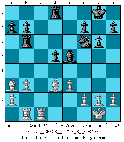 Last move : 1-0 2010 November 27 22:49:12 [Event "FICGS__CHESS__CLASS_B__000125"] [Site "FICGS"] [Date "2010.09.20"] [Round "1"] [White "Germanes,Ramil"] [Black "Voveris,Saulius"] [Result "1-0"] [WhiteElo "1980"] [BlackElo "1800"] 1.d4 d5 2.c4 c6 3.Nf3 Nf6 4.Nc3 e6 5.e3 Nbd7 6.Qc2 Bd6 7.Bd3 e5 8.cxd5 cxd5 9.Nb5 Bb8 10.dxe5 Nxe5 11.Nxe5 Bxe5 12.O-O O-O 13.Bd2 Bd7 14.Qb3 Bxb5 15.Qxb5 Qb6 16.Bb4 Rfd8 17.Be7 Re8 18.Ba3 Re6 19.Qxb6 Rxb6 20.Rab1 Rd8 21.Rfc1 g6 22.b3 1-0 QGD Slav : 4.Nc3 Kingside Castling by player White (move 12) Kingside Castling by player Black (move 12) Player White won this chess game. Follow this game move after move (download)When I asked Fischer why he had not played a certain move in our game, he replied: 'Well, you laughed when I wrote it down !' (Mikhail Tal) Darum geht es im Schach. Einen Tag gibst du deinem Gegner eine Lektion, am nächsten Tag gibt er dir eine. (Robert James Fischer) Bobby es la celebridad menos entendida y malinterpretada que camina el la faz de esta tierra. (Yasser Seirawan) J'ai vu le vaincu d'Echecs jouer des années durant dans l'espoir de la fête de la victoire. Car tu es plus riche de ce qu'elle existe si même elle n'est point pour toi. Ainsi de la perle du fond des mers. (Antoine de Saint-Exupéry) Mandala - that's it! 16x16 squares as multiple of the four and the eight because of the Four Noble Truths and the Noble Eightfold Path. (Heinz-Georg Lehnhoff about Big Chess)