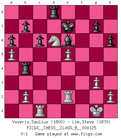 Last move : 0-1 2010 November 27 10:48:45 [Event "FICGS__CHESS__CLASS_B__000125"] [Site "FICGS"] [Date "2010.09.20"] [Round "1"] [White "Voveris,Saulius"] [Black "Lim,Steve"] [Result "0-1"] [WhiteElo "1800"] [BlackElo "1870"] 1.d4 d5 2.c4 e6 3.Nc3 Nf6 4.Nf3 c6 5.Bg5 h6 6.Bxf6 Qxf6 7.e3 Nd7 8.Bd3 Bd6 9.O-O Qe7 10.cxd5 exd5 11.e4 dxe4 12.Bxe4 O-O 13.Re1 Qd8 14.Bc2 Nf6 15.Qd3 Be6 16.Ne5 Re8 17.a4 Bxe5 18.dxe5 Qxd3 19.Bxd3 Rad8 20.Be4 Nxe4 21.Nxe4 Rd4 22.a5 Red8 23.Nd6 Rb4 24.Re2 f6 25.f4 Kf8 26.g3 fxe5 27.fxe5 Ke7 28.Rc1 a6 0-1 QGD Semi-Slav Kingside Castling by player White (move 9) Kingside Castling by player Black (move 12) Player Black won this chess game. Follow this game move after move (download)By playing at Chess then, we may learn: First: Foresight... Second: Circumspection... Third: Caution... And lastly, we learn by Chess the habit of not being discouraged by present bad appearances in the state of our affairs, the habit of hoping for a favorable chance, and that of persevering in the secrets of resources. (Benjamin Franklin) Die Partien sind immer verschieden, die Interviews immer die gleichen. (Garry Kasparov) Cuando tu casa esta en llamas, no puedes ser molestado por tus vecinos. O, como decinos en Ajedrez, si tu Rey esta bajo ataque, no te preocupa perder un Peón del lado de la Reina. (Gary Kasparov) Si je n'étais pas joueur d'échecs, je serais le meilleur dans quelque chose d'autre. (Anatoli Karpov) I find your interest interesting. (Gregory House, House M.D.)