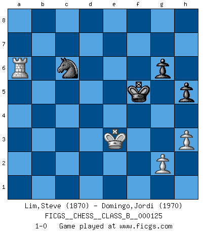 Last move : 1-0 2011 June 26 22:22:11 [Event "FICGS__CHESS__CLASS_B__000125"] [Site "FICGS"] [Date "2010.09.20"] [Round "1"] [White "Lim,Steve"] [Black "Domingo,Jordi"] [Result "1-0"] [WhiteElo "1870"] [BlackElo "1970"] 1.d4 d5 2.c4 dxc4 3.Nf3 a6 4.e3 Bg4 5.Bxc4 e6 6.Nbd2 Nf6 7.Qb3 Nc6 8.Ne5 Nxe5 9.dxe5 Nd7 10.Qxb7 Nxe5 11.f4 Nd7 12.O-O Bc5 13.Ne4 O-O 14.Bxa6 Bf5 15.Ng3 Nf6 16.Bc4 Qd6 17.Nxf5 exf5 18.h3 Ne4 19.Qb3 Rad8 20.a4 Rd7 21.a5 Rfd8 22.a6 c6 23.Qc2 h6 24.Ra5 Qc7 25.b4 Bxb4 26.Rxf5 Ng3 27.Rxf7 Rxf7 28.Rd1 Rd5 29.Kh2 Ne4 30.Bb2 Nd6 31.Be5 Rxe5 32.Bxf7+ Nxf7 33.fxe5 Qxe5+ 34.Kg1 Bc5 35.Qb3 Qe7 36.Kh1 Ba7 37.Rc1 Qd6 38.Rf1 Qd5 39.Qb7 Bxe3 40.Qb8+ Kh7 41.Qb1+ g6 42.Qb7 Kg7 43.Qe7 Bd4 44.a7 Bxa7 45.Qxa7 Qe6 46.Qd4+ Kh7 47.Qf6 Qxf6 48.Rxf6 Kg7 49.Rxc6 h5 50.Kg1 Ne5 51.Ra6 Kh6 52.Kf1 Kg5 53.Kf2 Kf4 54.Ra4+ Kf5 55.Ke3 Nc6 56.Ra6 1-0 QGA : Alekhine defense Kingside Castling by player White (move 12) Kingside Castling by player Black (move 13) 10 pieces endgame at move 47 : White KRPP , Black KQNPPP WHITE : King + 1 Rook 2 Pawns BLACK : King + 1 Queen 1 Knight 3 Pawns 9 pieces endgame at move 48 : White KRPP , Black KNPPP WHITE : King + 1 Rook 2 Pawns BLACK : King + 1 Knight 3 Pawns 8 pieces endgame at move 49 : White KRPP , Black KNPP WHITE : King + 1 Rook 2 Pawns BLACK : King + 1 Knight 2 Pawns Player White won this chess game. Follow this game move after move (download)If your opponent cannot do anything active, then don't rush the position; instead you should let him sit there, suffer, and beg you for a draw. (Jeremy Silman) Ich habe die besten Aussichten, den ersten Preis zu gewinnen - denn jeder muss gegen Steinitz spielen, nur ich nicht! (Wilhelm Steinitz) Debemos de asegurarnos de que el Ajedrez no se convierta en un lenguaje muerto, muy interesante, pero solo para un grupo muy pequeño. (Sytze Faber) L'attaque fait le spectacle, la défense gagne les matchs. (Dicton footballistique) History is a gallery of pictures in which there are few originals and many copies. (Alexis de Tocqueville)