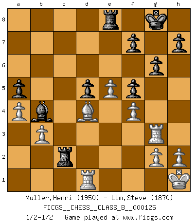 Last move : 1/2-1/2 2010 October 21 9:2:39 [Event "FICGS__CHESS__CLASS_B__000125"] [Site "FICGS"] [Date "2010.09.20"] [Round "1"] [White "Muller,Henri"] [Black "Lim,Steve"] [Result "1/2-1/2"] [WhiteElo "1950"] [BlackElo "1870"] 1.e4 e6 2.d4 d5 3.Nc3 Nf6 4.e5 Nfd7 5.f4 c5 6.Nf3 Nc6 7.Be3 Be7 8.Qd2 O-O 9.Be2 a6 10.O-O b5 11.a3 Qc7 12.Rad1 Bb7 13.Qe1 Na5 14.dxc5 Nc4 15.Bc1 Bxc5+ 16.Kh1 Rac8 17.Bd3 Be7 18.Qg3 g6 19.Nd4 Kh8 20.a4 b4 21.Nce2 Nc5 22.b3 Na3 23.Bb2 Nxd3 24.Qxd3 a5 25.Rf3 Rfe8 26.Rh3 Kg8 27.c3 Bf8 28.Nf3 Qc6 29.Ned4 Ba6 30.Nxc6 Bxd3 31.Nfd4 Bf5 32.Rg3 Nc2 33.cxb4 Nxd4 34.Nxd4 Bxb4 35.Nxf5 exf5 36.Bd4 Rc2 1/2-1/2 French : Steinitz, Boleslavsky variation Kingside Castling by player Black (move 8) Kingside Castling by player White (move 10) This chess game ended in a draw. Follow this game move after move (download)If cunning alone were needed to excel, women would be the best Chess players. (Albin) Am wohlsten fühle ich mich, wenn ich sehe, wie sich mein Gegner im Todeskampf windet. (Robert James Fischer) El muchacho (en ese entonces un niño de 12 años llamado Anatoly Karpov) no tiene ni idea de lo que es el Ajedrez y no hay futuro en absoluto para el en esta profesión. (Mikhail Botvinnik) Les réformistes prétendent que les progrès de la théorie conduiront à la disparition des échecs, et qu'il faut, pour leur rendre vie, en remanier les règles. En réalité, qu'exprime cette affirmation? Le mépris de l'intuition, de l'imagination et de tous les autres éléments qui font des échecs un art. (Alexander Alekhine) The only thing that overcomes hard luck is hard work. (Harry Golden)