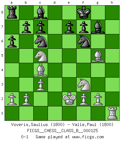 Last move : 0-1 2010 November 27 22:49:12 [Event "FICGS__CHESS__CLASS_B__000125"] [Site "FICGS"] [Date "2010.09.20"] [Round "1"] [White "Voveris,Saulius"] [Black "Valle,Paul"] [Result "0-1"] [WhiteElo "1800"] [BlackElo "1800"] 1.d4 g5 2.e4 g4 3.h3 d5 4.hxg4 dxe4 5.Nc3 Bg7 6.Nxe4 Qxd4 7.Qxd4 Bxd4 8.g5 Nc6 9.c3 Bg7 10.Nf3 h6 11.Nc5 hxg5 12.Rxh8 Bxh8 13.Bxg5 a6 14.Bc4 Nf6 15.Ke2 Bg7 16.Rh1 Kf8 0-1 Queen's pawn Player Black won this chess game. Follow this game move after move (download)Bobby just drops the pieces and they fall on the right squares. (Miguel Najdorf) Ich bin Weltmeister und muß mit niemandem irgend etwas diskutieren. (Viswanathan Anand) A través de las casillas del tablero, los Indios explican el movimiento del tiempo y la edad, las influencias mas altas que controlan el mundo y los lazos que vinculan al Ajedrez con el alma humana. (Al-Masudi) Les sacrifices démontrent seulement que quelqu'un a gaffé. (Savielly Tartacover) They say poker is a zero-sum game. It must be, because every time I play my sum ends up zero. (Max Shapiro)