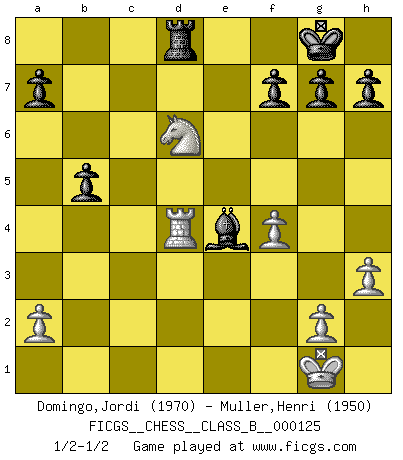 Last move : 1/2-1/2 2010 November 14 17:51:31 [Event "FICGS__CHESS__CLASS_B__000125"] [Site "FICGS"] [Date "2010.09.20"] [Round "1"] [White "Domingo,Jordi"] [Black "Muller,Henri"] [Result "1/2-1/2"] [WhiteElo "1970"] [BlackElo "1950"] 1.b4 e5 2.Bb2 d6 3.c4 Nf6 4.e3 Be7 5.Nc3 O-O 6.Nf3 Bf5 7.h3 Nbd7 8.d4 exd4 9.Nxd4 Bg6 10.Be2 c5 11.bxc5 dxc5 12.Nf3 Ne4 13.Nd5 Nb6 14.O-O Nxd5 15.cxd5 Bf6 16.Ne5 Re8 17.f4 Qc7 18.Bf3 Rad8 19.Qa4 c4 20.Rac1 Qc5 21.Bd4 Qxd5 22.Qxc4 Qxc4 23.Nxc4 Bxd4 24.exd4 Rxd4 25.Rfd1 Rxd1+ 26.Rxd1 b5 27.Bxe4 Bxe4 28.Nd6 Rd8 29.Rd4 1/2-1/2 Polish (Sokolsky) opening Kingside Castling by player Black (move 5) Kingside Castling by player White (move 14) This chess game ended in a draw. Follow this game move after move (download)Your body has to be in top condition. Your Chess deteriorates as your body does. You can't separate body from mind. (Bobby Fischer) Konzentriere dich auf materielle Gewinne. Nimm, was dir dein Gegner gibt, ausser es gibt einen guten Grund der dagegenspricht. (Robert James Fischer) En posiciones complicadas, Bobby Fischer pocas veces tuvo que temer de cualquiera. (Paul Keres) On n'a jamais que l'âge auquel on a commence à jouer aux échecs car après on cesse de vieillir. (Capablanca) The Internet isn't free. It just has an economy that makes no sense to capitalism. (Brad Shapcott)