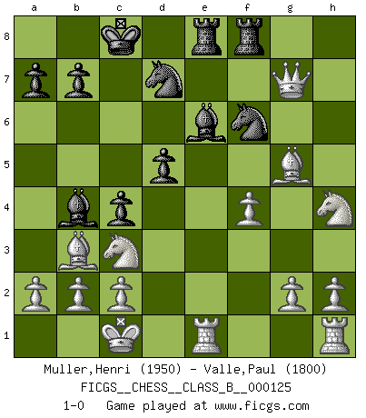 Last move : 1-0 2010 September 27 15:56:22 [Event "FICGS__CHESS__CLASS_B__000125"] [Site "FICGS"] [Date "2010.09.20"] [Round "1"] [White "Muller,Henri"] [Black "Valle,Paul"] [Result "1-0"] [WhiteElo "1950"] [BlackElo "1800"] 1.e4 f5 2.exf5 Nf6 3.Nf3 d6 4.Nd4 g6 5.fxg6 e5 6.Nf3 hxg6 7.Nc3 Qe7 8.Bc4 Bg4 9.d3 c6 10.Bg5 Nbd7 11.Qd2 d5 12.Bb3 Qg7 13.O-O-O O-O-O 14.Rde1 Re8 15.Nh4 Bb4 16.d4 Be6 17.f4 exd4 18.Qxd4 c5 19.Qd3 c4 20.Qxg6 Rhf8 21.Qxg7 1-0 Fred Queenside Castling by player White (move 13) Queenside Castling by player Black (move 13) Player White won this chess game. Follow this game move after move (download)Tactics flow from a superior position. (Bobby Fischer) Im Spitzenschach von heute geht es nur um Vorbereitung, um tiefgründige, sorgfältige Eröffnungsvorbereitung. (Nigel Short) La mitad de las variaciones que son calculadas en una partida de torneo, resultan ser completamente superfluas. Desafortunadamente, nadie sabe por adelantado cual mitad. (Jan Tinman) Si rien de grave n'est détecté lors de l'analyse d'une position, on joue alors le coup. Seconde règle de Blumenfeld. Convictions are more dangerous enemies of truth than lies. (Friedrich Nietzsche)