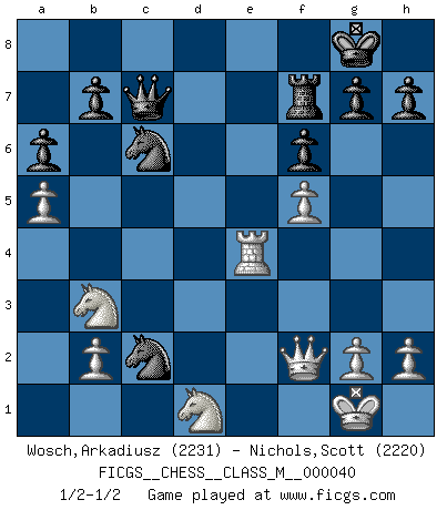 Last move : 1/2-1/2 2010 November 29 11:20:36 [Event "FICGS__CHESS__CLASS_M__000040"] [Site "FICGS"] [Date "2010.09.20"] [Round "1"] [White "Wosch,Arkadiusz"] [Black "Nichols,Scott"] [Result "1/2-1/2"] [WhiteElo "2231"] [BlackElo "2220"] 1.e4 c5 2.Nf3 e6 3.d4 cxd4 4.Nxd4 a6 5.Bd3 Bc5 6.Nb3 Ba7 7.Qe2 Ne7 8.O-O O-O 9.Be3 Bxe3 10.Qxe3 Nbc6 11.Nc3 d6 12.f4 Qc7 13.a4 Nb4 14.Rad1 Bd7 15.a5 Rac8 16.f5 f6 17.Be2 exf5 18.Qd2 Be8 19.exf5 Bf7 20.Rf4 Nec6 21.Bc4 d5 22.Bxd5 Rcd8 23.Bxf7+ Rxf7 24.Qf2 Rxd1+ 25.Nxd1 Nxc2 26.Re4 1/2-1/2 Sicilian : Kan, Polugaievsky variation Kingside Castling by player White (move 8) Kingside Castling by player Black (move 8) This chess game ended in a draw. Follow this game move after move (download)Chess teaches you to control the initial excitement you feel when you see something that looks good and it trains you to think objectively when you're in trouble. (Stanley Kubrick) Ich habe die Schachforschung dermaßen betrieben, dass sie auf eine wissenschaftliche Basis gestellt wurde. (Mikhail Moiseyevich Botvinik) El hombre es un frívolo, una creatura engañosa y como un jugador de Ajedrez, se preocupa mas por el proceso de obtener su meta que de la meta por sí misma. (Dostoyevsky) Aucun coup ne doit être joué sans but. (Pedro Damiano) Mac users swear by their computers. PC users swear at their computers. (Author unknown)