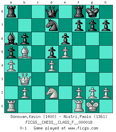 Last move : 0-1 2007 March 7 0:45:53 [Event "FICGS__CHESS__CLASS_F__000018"] [Site "FICGS"] [Date "2006.11.22"] [Round "1"] [White "Donovan,Kevin"] [Black "Nistri,Paolo"] [Result "0-1"] [WhiteElo "1400"] [BlackElo "1361"] 1.d4 d5 2.c4 c6 3.Nf3 Nf6 4.e3 e6 5.Nc3 Bb4 6.Qb3 a5 7.Bd2 O-O 8.cxd5 Nxd5 9.Nxd5 Bxd2+ 10.Nxd2 cxd5 11.Bd3 Nd7 12.O-O Nf6 13.e4 b6 14.e5 Nd7 15.a4 Bb7 16.Bb5 Ba6 0-1 This chess game has been lost on time (started : 2006.11.22 21:25:30) QGD Slav : 4.e3 Kingside Castling by player Black (move 7) Kingside Castling by player White (move 12) Player Black won this chess game. Follow this game move after move (download)Fischer is the strongest player in the world. In fact, the strongest player who ever lived. (Larry Evans) Wenn Du einsam bist, wenn Du Dich in der Welt wie ein Fremder fühlst, spiele Schach. Das wird Deinen Geist erheben und Dein Ratgeber im Kampf sein. (Aristoteles) ¿Porque tengo que perder ante este idiota?. (Aron Nimzovich) 'L'échange des dames est un coup dur pour les deux adversaires...' Un journaliste lors d'une partie du match Spassky-Fischer Programming can only do so much before it becomes too much. (Don Groves)