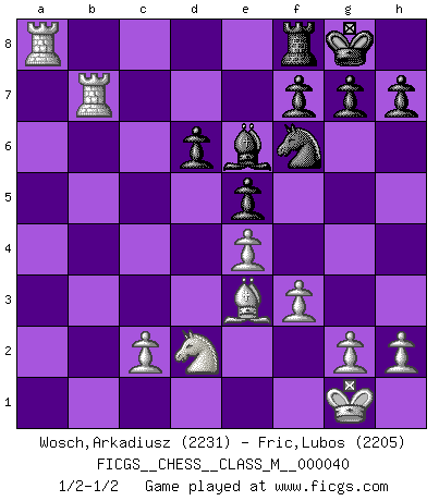 Last move : 1/2-1/2 2011 May 17 15:54:23 [Event "FICGS__CHESS__CLASS_M__000040"] [Site "FICGS"] [Date "2010.09.20"] [Round "1"] [White "Wosch,Arkadiusz"] [Black "Fric,Lubos"] [Result "1/2-1/2"] [WhiteElo "2231"] [BlackElo "2205"] 1.e4 c5 2.Nf3 d6 3.d4 cxd4 4.Nxd4 Nf6 5.Nc3 a6 6.Be2 e5 7.Nb3 Be7 8.O-O O-O 9.Be3 Be6 10.Qd2 a5 11.Rfd1 a4 12.Nc1 a3 13.bxa3 Rxa3 14.Nb3 Ng4 15.Bxg4 Bxg4 16.Rdb1 Nd7 17.Nd5 Nf6 18.Qb4 Ra8 19.Nxe7+ Qxe7 20.Nd2 Be6 21.Qxb7 Qxb7 22.Rxb7 Bxa2 23.f3 Be6 24.Rxa8 1/2-1/2 Sicilian : Najdorf, Opovcensky variation Kingside Castling by player White (move 8) Kingside Castling by player Black (move 8) This chess game ended in a draw. Follow this game move after move (download)There just isn't enough televised Chess. (David Letterman) Der 70jährige Viktor Kortschnoi: Die Rentenanstalt wollte mich zwingen in Rente zu gehen. Meine Frau erhält jetzt eine Pension- und ich zahle weiter in die Rentenkasse ein! (Viktor Kortschnoi) En un gambito tu regalas un Peón por el bién de tomar un juego perdido. (Samuel Standige Boden) Demandez au pauvre Cg1 ce qu'il en pense. Eduard Gufeld à propos de la variante Saemisch de l'Est-Indienne. The smarter you play, the luckier you'll be. (Mark Pilarski)