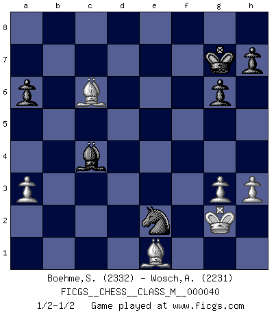 Last move : 1/2-1/2 2011 July 15 0:56:39 [Event "FICGS__CHESS__CLASS_M__000040"] [Site "FICGS"] [Date "2010.09.20"] [Round "1"] [White "Boehme,Sebastian"] [Black "Wosch,Arkadiusz"] [Result "1/2-1/2"] [WhiteElo "2332"] [BlackElo "2231"] 1.e4 c5 2.c3 Nf6 3.e5 Nd5 4.Nf3 e6 5.d4 cxd4 6.cxd4 d6 7.Bc4 Nc6 8.O-O Be7 9.Bd2 O-O 10.a3 Nb6 11.Ba2 d5 12.Qe2 Bd7 13.Nc3 f6 14.exf6 Bxf6 15.Be3 Nc8 16.Rad1 Nd6 17.Ne5 Nf5 18.f4 Bxe5 19.fxe5 Qb6 20.Bf2 Rac8 21.h3 Na5 22.Nxd5 exd5 23.Bxd5+ Kh8 24.b4 Bb5 25.bxa5 Qxa5 26.Qe1 Qa4 27.Bxb7 Rcd8 28.Qe4 Nxd4 29.e6 Ne2+ 30.Kh2 Rxd1 31.e7 Rg8 32.Qxa4 Bxa4 33.Rxd1 Bxd1 34.Bc6 a6 35.e8Q Rxe8 36.Bxe8 Bb3 37.Bc6 Bc4 38.Be1 g6 39.g3 Kg7 40.Kg2 1/2-1/2 Sicilian : Alapin's variation (2.c3) Kingside Castling by player White (move 8) Kingside Castling by player Black (move 9) Promotion Queen by player White (move 35) This chess game ended in a draw. Follow this game move after move (download)Bobby Fischer's current state of mind is indeed a tragedy. One of the world's greatest Chess players - the pride and sorrow of American Chess. (Frank Brady) Ein unbeabsichtigtes Patt ist der Gipfel der Dummheit. (Anonymous) Un buen jugador siempre tiene buena suerte. (José Raúl Capablanca) Nous vivons dans un monde échiquéen : chaque jour qui passe est un défi à relever. (Philosophe Sasha) Art is the triumph over chaos. (John Cheever)