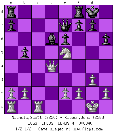 Last move : 1/2-1/2 2011 January 23 12:21:16 [Event "FICGS__CHESS__CLASS_M__000040"] [Site "FICGS"] [Date "2010.09.20"] [Round "1"] [White "Nichols,Scott"] [Black "Kipper,Jens"] [Result "1/2-1/2"] [WhiteElo "2220"] [BlackElo "2383"] 1.d4 Nf6 2.c4 e6 3.g3 d5 4.Nf3 dxc4 5.Bg2 Be7 6.Qa4+ c6 7.Qxc4 O-O 8.O-O b5 9.Qc2 Bb7 10.Nc3 Nbd7 11.Bg5 h6 12.Bxf6 Nxf6 13.Ne4 Nxe4 14.Qxe4 Rc8 15.Ne5 Ba8 16.Qd3 Bd6 17.Qe3 Qc7 18.Nd3 c5 19.Bxa8 cxd4 20.Qxd4 Rxa8 21.Rfc1 Qe7 22.Ne5 1/2-1/2 Catalan Opening Kingside Castling by player Black (move 7) Kingside Castling by player White (move 8) This chess game ended in a draw. Follow this game move after move (download)A good sacrifice is one that is not necessarily sound but leaves your opponent dazed and confused. (Rudolph Spielmann) Ihnen, Herr Lasker, habe ich nur drei Worte zu sagen: Schach und matt. (Siegbert Tarrasch) El sobresalir en el Ajedrez es un signo de una mente intrigante. (Sir Arthur Conan Doyle) L'attaque fait le spectacle, la défense gagne les matchs. (Dicton footballistique) The various flowers seem good to different people. (Chinese proverb)