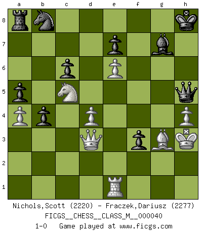 Last move : 1-0 2011 March 29 14:58:31 [Event "FICGS__CHESS__CLASS_M__000040"] [Site "FICGS"] [Date "2010.09.20"] [Round "1"] [White "Nichols,Scott"] [Black "Fraczek,Dariusz"] [Result "1-0"] [WhiteElo "2220"] [BlackElo "2277"] 1.d4 d5 2.c4 c6 3.Nc3 Nf6 4.g3 dxc4 5.Nf3 g6 6.Bg2 Bg7 7.e4 O-O 8.O-O b5 9.Qe2 a5 10.Rd1 Ba6 11.Bf4 b4 12.Na4 Bb5 13.Nc5 c3 14.Qc2 cxb2 15.Qxb2 Nfd7 16.e5 Nb6 17.a4 Bc4 18.e6 f6 19.Nd2 Bd5 20.Bf1 Qc8 21.Ndb3 g5 22.Be3 Qe8 23.Qc2 Qh5 24.Be2 Qg6 25.Bd3 f5 26.Rf1 Qf6 27.f4 g4 28.Rae1 h5 29.Bf2 Qg6 30.Nd2 Kh7 31.Nc4 Nxc4 32.Bxc4 Bxc4 33.Qxc4 h4 34.gxh4 Rd8 35.Kh1 Qh6 36.Qd3 Rd5 37.h3 Kh8 38.hxg4 fxg4 39.f5 Qh5 40.Kg2 Rxf5 41.Bg3 Rf3 42.Rxf3 gxf3+ 43.Kh3 1-0 QGD Slav defense Kingside Castling by player Black (move 7) Kingside Castling by player White (move 8) Player White won this chess game. Follow this game move after move (download)Suddenly it was obvious to me in my analysis I had missed what Fischer had found with the greatest of ease at the board. (Mikhail Botvinnik) Es hat in meinem Leben Zeiten gegeben, in denen das Schachspiel, wenn nicht zum Lebenszweck, so doch zu einem regelrechten Lebensersatz geworden ist. Man fühlt sich in solchen Zeiten nicht so, als besäße man eine göttliche Gabe, sondern eher so, als sei man von ihr besessen. (Garry Kasparov) La estratégia requiere pensar, la táctica requiere observación. (Max Euwe) Seul un grand joueur sait à quel point il joue faiblement. (Xavier Tartacover) First of all, we have to go back to the classical time control. (Anatoly Karpov)