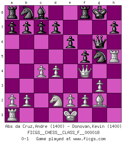 Last move : 0-1 2007 April 25 0:37:41 [Event "FICGS__CHESS__CLASS_F__000018"] [Site "FICGS"] [Date "2006.11.22"] [Round "1"] [White "Abs da Cruz,Andre"] [Black "Donovan,Kevin"] [Result "0-1"] [WhiteElo "1400"] [BlackElo "1400"] 1.d4 f5 2.g3 Nf6 3.Bg2 e6 4.c4 g6 5.Bg5 Be7 6.Nf3 O-O 7.Qd2 Ne4 8.Qf4 Bxg5 9.Nxg5 Nxg5 10.h4 Ne4 11.h5 Qf6 12.hxg6 Qxg6 13.Rh6 Qg7 14.Nd2 Ng5 15.Rh5 Qg6 0-1 This chess game has been lost on time (started : 2006.11.22 21:25:30) Dutch defense Kingside Castling by player Black (move 6) Player Black won this chess game. Follow this game move after move (download)The mistakes are there, waiting to be made. (Savielly Tartakower) Spiel ein langweiliges Spiel zu Ende und lustige Dinge können passieren. (Hans Ree) Coloca el contenido de las piezas del Ajedrez en un sombrero, agitalo vigorosamente, arrojalas en un tablero desde una altura de 30 centimetros y así obtendras el estilo de Steinitz. (H. E. Bird) On entre au jeu d'Echecs comme on entre en Religion. Pour le joueur d'Echecs, la partie d'Echecs c'est l'office, la messe, le défilé du 1er Mai, le dépôt de gerbe au Monument aux Morts. C'est un drame sacré. (Michel Roos) To err is human, to shift the blame on someone else is tactical. (Mladen Jankovic)