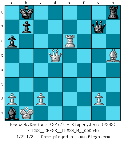 Last move : 1/2-1/2 2011 September 18 22:39:40 [Event "FICGS__CHESS__CLASS_M__000040"] [Site "FICGS"] [Date "2010.09.20"] [Round "1"] [White "Fraczek,Dariusz"] [Black "Kipper,Jens"] [Result "1/2-1/2"] [WhiteElo "2277"] [BlackElo "2383"] 1.e4 e6 2.d4 d5 3.Nc3 Nf6 4.Bg5 Bb4 5.e5 h6 6.Bh4 g5 7.Bg3 Ne4 8.Nge2 h5 9.f3 Nxg3 10.hxg3 Be7 11.Qd2 Bd7 12.f4 c5 13.dxc5 Nc6 14.Nd4 Nxd4 15.Qxd4 Rc8 16.O-O-O Bxc5 17.Qd3 Qc7 18.Be2 h4 19.fxg5 Qxe5 20.Kb1 hxg3 21.Rxh8+ Qxh8 22.Qxg3 Qg7 23.Bd3 Kd8 24.Rf1 a6 25.Ne2 Be7 26.g6 fxg6 27.Bxg6 Bf6 28.Nf4 Be5 29.Qg5+ Kc7 30.Re1 Bxb2 31.Nxe6+ Bxe6 32.Rxe6 Kb8 33.Qxd5 Rh8 34.Bh5 Ba1 35.Rb6 Be5 36.Re6 Ba1 1/2-1/2 French : MacCutcheon, Bernstein variation Queenside Castling by player White (move 16) This chess game ended in a draw. Follow this game move after move (download)Fischer is an American Chess tragedy on par with Morphy and Pillsbury. (Mig Greengard) Alles was am Schachbrett zählt sind gute Züge. (Robert James Fischer) El arma más poderosa en el Ajedrez, es tener la próxima movida. (David Bronstein) Vouloir jouer aux échecs contre soi-même est aussi paradoxal que vouloir marcher sur son ombre. (Stefan Zweig) The obstacle is the path. (Zen proverb)