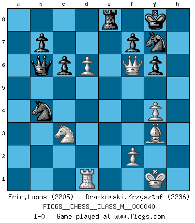 Last move : 1-0 2011 June 3 15:17:26 [Event "FICGS__CHESS__CLASS_M__000040"] [Site "FICGS"] [Date "2010.09.20"] [Round "1"] [White "Fric,Lubos"] [Black "Drazkowski,Krzysztof"] [Result "1-0"] [WhiteElo "2205"] [BlackElo "2236"] 1.d4 Nf6 2.c4 e6 3.Nc3 d5 4.cxd5 exd5 5.Bg5 Be7 6.e3 O-O 7.Bd3 c6 8.Qc2 Nbd7 9.Nf3 Re8 10.O-O Nf8 11.h3 g6 12.Bf4 Nh5 13.Bh2 Ng7 14.e4 dxe4 15.Bxe4 Bf5 16.Rfe1 Qb6 17.Rad1 Rad8 18.g4 Bxe4 19.Rxe4 Nfe6 20.d5 Nc5 21.Re3 Bf6 22.Ne5 h6 23.Bf4 Qb4 24.Bg3 Qb6 25.Qe2 h5 26.Qc4 hxg4 27.hxg4 a5 28.a3 Re7 29.b4 axb4 30.axb4 Na6 31.Qf4 Bxe5 32.Rxe5 Rxe5 33.Qxe5 Nxb4 34.d6 Re8 35.Qf6 1-0 Queen's pawn game Kingside Castling by player Black (move 6) Kingside Castling by player White (move 10) Player White won this chess game. Follow this game move after move (download)Do you realize Fischer almost never has any bad pieces? He exchanges them, and the bad pieces remain with his opponents. (Yuri Balashov) Die Elozahlen sind sehr schlecht für das Schach. Jetzt ist Schach eine Sportindustrie, die darauf zielt Elopunkte zu machen. (Miguel Najdorf) Debemos de asegurarnos de que el Ajedrez no se convierta en un lenguaje muerto, muy interesante, pero solo para un grupo muy pequeño. (Sytze Faber) Votre prénom est 'Tactique', votre deuxième prénom est 'Tactique' et votre nom est 'Tactique'. (Ken Smith) Information on the Internet is subject to the same rules and regulations as conversation at a bar. (George Lundberg)