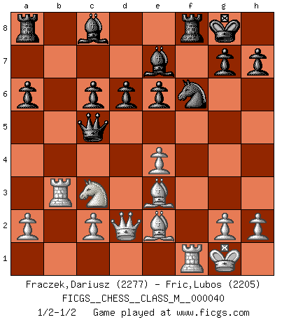 Last move : 1/2-1/2 2011 February 19 1:16:6 [Event "FICGS__CHESS__CLASS_M__000040"] [Site "FICGS"] [Date "2010.09.20"] [Round "1"] [White "Fraczek,Dariusz"] [Black "Fric,Lubos"] [Result "1/2-1/2"] [WhiteElo "2277"] [BlackElo "2205"] 1.e4 c5 2.Nf3 d6 3.d4 cxd4 4.Nxd4 Nf6 5.Nc3 a6 6.Bg5 e6 7.f4 Qb6 8.Qd2 Qxb2 9.Rb1 Qa3 10.f5 Nc6 11.fxe6 fxe6 12.Nxc6 bxc6 13.Be2 Be7 14.O-O O-O 15.Rb3 Qc5+ 16.Be3 Qe5 17.Bf4 Qc5+ 18.Be3 1/2-1/2 Sicilian : Najdorf, 7...Qb6 Kingside Castling by player White (move 14) Kingside Castling by player Black (move 14) This chess game ended in a draw. Follow this game move after move (download)The passed pawn is a criminal, who should be kept under lock and key. Mild measures, such as police surveillance, are not sufficient. (Nimzovitch) Es ist peinlich, dass ich nie Weltmeister wurde. Es wäre leicht, Leonid Breschnjew als Ursache vorzuschieben, dessen Apparat den Vorzeigekommunisten Anatoli Karpow in allem unterstützte. Aber Garri Kasparow zum Beispiel, der ebenfalls von den Sowjets unerwünscht war, hat trotz der Widerstände den WM-Titel erobert. (Viktor Kortschnoi) La última cosa en que Fischer estaba interesado era en tonterías, siempre y cuando el Ajedrez estuviera involucrado. (Elie Agur) Si rien de grave n'est détecté lors de l'analyse d'une position, on joue alors le coup. Seconde règle de Blumenfeld. The only sure thing about luck is that it will change. (Wilson Mizner)