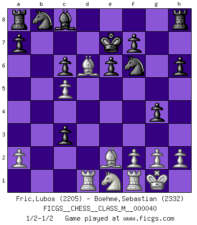Last move : 1/2-1/2 2011 March 2 16:54:11 [Event "FICGS__CHESS__CLASS_M__000040"] [Site "FICGS"] [Date "2010.09.20"] [Round "1"] [White "Fric,Lubos"] [Black "Boehme,Sebastian"] [Result "1/2-1/2"] [WhiteElo "2205"] [BlackElo "2332"] 1.d4 d5 2.c4 e6 3.Nc3 Nf6 4.Nf3 c6 5.Bg5 h6 6.Bh4 dxc4 7.e4 g5 8.Bg3 b5 9.Be2 b4 10.Na4 Nxe4 11.Be5 Nf6 12.Nc5 c3 13.bxc3 bxc3 14.O-O g4 15.Ne1 Bxc5 16.dxc5 Qxd1 17.Rxd1 Ke7 18.Bd6+ 1/2-1/2 QGD Semi-Slav Kingside Castling by player White (move 14) This chess game ended in a draw. Follow this game move after move (download)A passed Pawn increases in strength as the number of pieces on the board diminishes. (Capablanca) Kasparov ist eine Art Monster mit hundert Augen, denen auch nicht das Geringste entgeht. (Tony Miles) Una de estas pequeñas movidas modestas pudieran ser mas molestas a tu oponente que la amenaza mas grande. (Siegbert Tarrasch) Aucun coup ne doit être joué sans but. (Pedro Damiano) Macintosh - we might not get everything right, but at least we knew the century was going to end. (Douglas Adams)