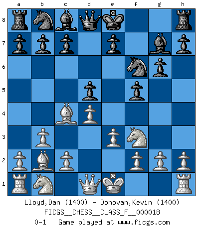 Last move : 0-1 2007 January 20 6:47:37 [Event "FICGS__CHESS__CLASS_F__000018"] [Site "FICGS"] [Date "2006.11.22"] [Round "1"] [White "Lloyd,Dan"] [Black "Donovan,Kevin"] [Result "0-1"] [WhiteElo "1400"] [BlackElo "1400"] 1.d4 f5 2.Nf3 g6 3.e3 d6 4.b3 Nf6 5.Bb2 Bg7 6.Bc4 d5 0-1 This chess game has been lost on time (started : 2006.11.22 21:25:30) Dutch Player Black won this chess game. Follow this game move after move (download)The laws of Chess do not permit a free choice: you have to move whether you like it or not. (Emanuel Lasker) Taktik ist was man tun muß, wenn etwas zu tun ist. Strategie ist was man tun muß, wenn nichts zu tun ist. (Savielly Grigorievitsch Tartakower) Del Ajedrez se ha dicho que la vida no es lo suficientemente larga para él, pero eso es culpa de la vida, no del Ajedrez. (William Ewart Napier) Les Echecs ne sont pas pour les âmes timides. Ils requièrent un homme entier, qui ne s'arrête pas aveuglément à ce qui a été déjà établi, mais qui tente individuellement de sonder les profondeurs du jeu. (W. Steinitz) Shallow men believe in luck. Strong men belive in cause and effect. (Ralph Waldo Emerson)