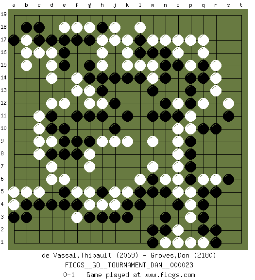 Last move : 0-1 2011 January 17 1:10:34 [Event "FICGS__GO__TOURNAMENT_DAN__000023 "] [Site "FICGS"] [Date "2010.09.22"] [Round "1"] [Black "de Vassal,Thibault "] [White "Groves,Don "] [Result "0-1"] [Rating 1 "2069"] [Rating 2 "2180"] 1.q4 q16 2.d4 c16 3.e17 h16 4.e15 d14 5.c17 b17 6.c18 d16 7.e16 c11 8.h18 j17 9.b18 j18 10.n16 o17 11.r10 r13 12.n14 r6 13.r5 q6 14.o4 p10 15.q10 p11 16.p9 o9 17.p8 o8 18.p7 o7 19.p6 o6 20.n12 p5 21.q5 o5 22.s6 p4 23.q3 p3 24.q2 f3 25.h3 f5 26.h5 d6 27.e5 e6 28.f4 g4 29.e4 g5 30.g3 h4 31.j3 j4 32.k3 n17 33.m11 m9 34.k11 f13 35.h11 k9 36.k14 c5 37.c4 b5 38.f11 h9 39.e10 e12 40.g9 g8 41.f9 d9 42.f8 g7 43.l4 k5 44.l5 l6 45.d10 c10 46.q14 r14 47.q15 r15 48.p16 q17 49.b4 a4 50.a3 a5 51.b3 b15 52.a17 b16 53.m16 m17 54.l17 k16 55.l16 l18 56.n3 o16 57.o15 f18 58.f17 g18 59.g14 f14 60.g15 g13 61.h13 o2 62.n2 n1 63.m1 o1 64.m2 k15 65.j14 h15 66.h14 p17 67.p12 o12 68.o11 q12 69.p13 o10 70.n11 l15 71.l14 m15 72.n15 m14 73.m13 p15 74.p14 e18 75.d17 g12 76.g11 h12 77.j12 d15 78.s11 s12 79.d8 c8 80.e9 c9 81.g17 h17 82.d11 d12 83.j10 j9 84.m6 m7 85.n5 n6 86.m5 d7 87.e8 q1 88.r1 p1 89.r2 k17 90.k4 j5 0-1 Here are the names of the openings (joseki) played in the four corners : Corner d16 : c16 e17Komoku (Somok, Xiao~mu`) 3-4 Point. The komoku (3-4) point is the traditional corner enclosure move..Ikken Kakari (Hankan Keolch'im, Yi Gua`jiao~, 1-Space Low Pincer). The small knight move is the basic approach move to the 3-4 point stone. It has been continually used for over four centuries. There are limitless variations, with new moves constantly being discovered. Black 2 opens the door to a treaure store of joseki. Corner q16 : q16 n16Hoshi (Hwajeom, Seongjeom, Xingwei`) 4-4 Point. The star or hoshi (4-4) point, emphasizing influence at the potential expense of territory.Niken Takagakari (Dukan Nop'dakeolch'im, E`r Gaojia, 2-Space High Approach). Black 2 is a light approach move. Rarely played in even games, Black 2 is typically employed in handicap games. White continues with 6-4 or 3-10. In Korean Sunjang Baduk White has a stone on 8-4. Corner q4 : q4 r6Hoshi (Hwajeom, Seongjeom, Xingwei`) 4-4 Point. The star or hoshi (4-4) point, emphasizing influence at the potential expense of territory.Ikken Kakari (Hankan Keolch'im, Yi Gua`jiao~, 1-Space Low Approach). White 2 is the standard approach move to the 4-4. Corner d4 : d4 f3Hoshi (Hwajeom, Seongjeom, Xingwei`) 4-4 Point. The star or hoshi (4-4) point, emphasizing influence at the potential expense of territory.Ikken Kakari (Hankan Keolch'im, Yi Gua`jiao~, 1-Space Low Approach). White 2 is the standard approach move to the 4-4. Player White won this Go (weiqi, baduk) game.Follow this game move after move (download ) Each step in a ladder is worth 7 points. (Anonymous) Success without honor is an unseasoned dish; it will satisfy your hunger, but it won't taste good. (Joe Paterno)