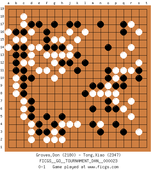 Last move : 0-1 2010 October 15 22:7:27 [Event "FICGS__GO__TOURNAMENT_DAN__000023"] [Site "FICGS"] [Date "2010.09.22"] [Round "1"] [Black "Groves,Don"] [White "Tong,Xiao"] [Result "0-1"] [Rating 1 "2180"] [Rating 2 "2347"] 1.q16 d4 2.q3 d16 3.q9 n4 4.f16 d14 5.d17 c17 6.e17 c18 7.k17 r5 8.p4 q6 9.p6 p7 10.o6 o8 11.m6 k4 12.o10 r7 13.n3 q11 14.m4 r14 15.n17 p10 16.h3 h4 17.g4 g3 18.f3 g2 19.h5 j4 20.f5 h2 21.d6 c6 22.d5 c5 23.e4 d3 24.d7 f2 25.e3 d2 26.p9 o9 27.o11 q13 28.o14 s16 29.f14 k15 30.k13 g15 31.f15 j13 32.j12 h13 33.h12 g13 34.f12 k12 35.k11 g12 36.g11 f13 37.c16 c15 38.e13 f11 39.e12 h11 40.l12 g10 41.d10 e14 42.g14 h15 43.h14 j14 44.g17 e11 45.c11 c7 46.c8 d12 47.b16 r17 48.q17 s3 49.b14 b15 50.c14 a16 51.c13 d13 52.q10 p11 53.s10 r11 54.s11 s12 55.o7 p8 56.n9 n8 57.m9 m8 58.l8 b8 59.c9 j16 60.j17 c12 61.b12 a14 62.b13 b10 63.b11 b9 64.c10 l16 0-1 Here are the names of the openings (joseki) played in the four corners : Corner d16 : d16 f16 Hoshi (Hwajeom, Seongjeom, Xingwei`) 4-4 Point. The star or hoshi (4-4) point, emphasizing influence at the potential expense of territory. Ikken Takagakari (Hankan Nop'dakeolch'im, Yi Gaojia, 1-Space High Approach). White typically responds at 6-4 or 3-10. White 4-10 is played when White finds play on the right side advantageous. White 4-8 or 3-8 may be played when White has support at top. Corner q16 : q16 q11 Hoshi (Hwajeom, Seongjeom, Xingwei`) 4-4 Point. The star or hoshi (4-4) point, emphasizing influence at the potential expense of territory. Corner d4 : d4 h3 Hoshi (Hwajeom, Seongjeom, Xingwei`) 4-4 Point. The star or hoshi (4-4) point, emphasizing influence at the potential expense of territory. Player White won this Go (weiqi, baduk) game. Follow this game move after move (download)Strange things happen at the one-two points. (Anonymous) Lamb in skin of tiger, still fears the wolf. (Chinese proverb)