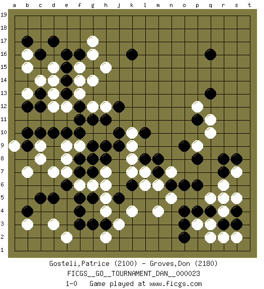 Last move : 1-0 2010 October 11 2:21:34 [Event "FICGS__GO__TOURNAMENT_DAN__000023"] [Site "FICGS"] [Date "2010.09.22"] [Round "1"] [Black "Gosteli,Patrice"] [White "Groves,Don"] [Result "1-0"] [Rating 1 "2100"] [Rating 2 "2180"] 1.q16 d3 2.d5 r4 3.f4 d15 4.p4 p3 5.o3 q3 6.o4 r6 7.d10 k4 8.k6 h4 9.f3 m4 10.j5 n5 11.p6 n7 12.q4 q5 13.o6 h2 14.r3 r2 15.s3 s2 16.s4 r5 17.o2 q2 18.n6 m6 19.m7 l7 20.m8 l6 21.l8 k7 22.r7 s7 23.s8 s5 24.r8 g6 25.k16 d7 26.c13 k8 27.l10 q10 28.p11 p9 29.p8 q11 30.o9 c14 31.d17 d13 32.c12 c9 33.c16 b15 34.c10 f15 35.e16 b13 36.c5 p12 37.q13 b3 38.g5 f6 39.b4 b7 40.f8 h5 41.h3 j3 42.g3 f13 43.e6 e7 44.f7 e9 45.f11 f9 46.g9 g10 47.h9 h10 48.j9 h12 49.f10 g8 50.g7 h7 51.h8 e8 52.g8 a9 53.b10 e2 54.f5 h6 55.b9 c8 56.e10 k9 57.j10 k10 58.h11 g12 59.g11 g17 60.f16 g16 61.g15 h15 62.e15 f14 63.e14 d14 64.e13 e12 65.f12 d12 66.b12 b16 67.j12 g14 68.b17 1-0 Here are the names of the openings (joseki) played in the four corners : Corner d4 : d3 d5 Komoku (Somok, Xiao~mu`) 3-4 Point. The komoku (3-4) point is the traditional corner enclosure move.. Ikken Takagakari (Hankan Nop'dakeolch'im, Yi Gaogua`jiao~, 1-Space High Approach). The 5-4 approach move has become more popular in modern times, as modern Go emphasizes speed and influence. Corner q4 : r4 p4 Komoku (Somok, Xiao~mu`) 3-4 Point. The komoku (3-4) point is the traditional corner enclosure move.. Ikken Takagakari (Hankan Nop'dakeolch'im, Yi Gaogua`jiao~, 1-Space High Approach). The 5-4 approach move has become more popular in modern times, as modern Go emphasizes speed and influence. Corner d16 : d15 c13 Takamoku (Gomok, Gaomu`) 5-4 Point. The takamoku (high) point (5-4). With its emphasis on influence, the 5-4 point complements the 4-4 (hoshi) point in creating an influence-oriented fuseki. Player Black won this Go (weiqi, baduk) game. Follow this game move after move (download)The L-group is dead. (Anonymous) The Internet is the world's largest library. It's just that all the books are on the floor. (John Allen Paulos)