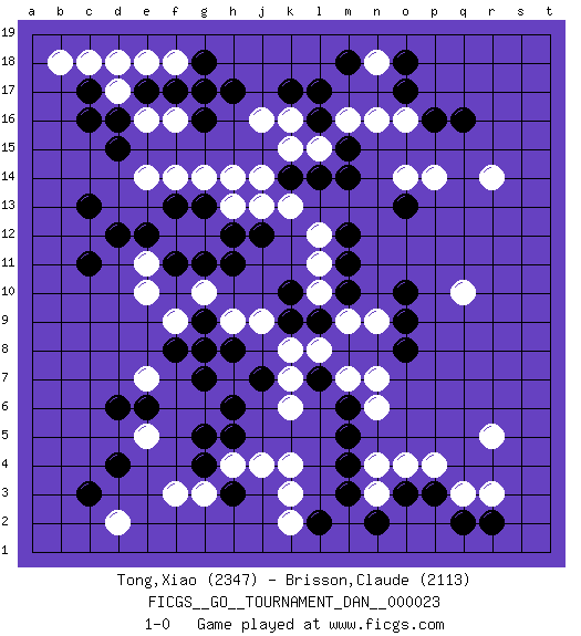 Last move : 1-0 2010 December 27 17:57:58 [Event "FICGS__GO__TOURNAMENT_DAN__000023"] [Site "FICGS"] [Date "2010.09.22"] [Round "1"] [Black "Tong,Xiao"] [White "Brisson,Claude"] [Result "1-0"] [Rating 1 "2347"] [Rating 2 "2113"] 1.q16 d17 2.d4 r3 3.d15 f16 4.c17 c18 5.c16 b18 6.c11 f3 7.d6 d2 8.c3 k4 9.m3 k3 10.p3 r5 11.m5 r14 12.o17 q10 13.h17 f14 14.e17 e16 15.d16 d18 16.f17 g17 17.g18 f18 18.g16 e18 19.g17 e14 20.c13 o4 21.o3 n4 22.m4 n3 23.n2 p4 24.l2 e10 25.e12 f12 26.f11 e11 27.d12 g12 28.h11 k13 29.g11 e7 30.h12 h13 31.g13 h14 32.f13 g14 33.l16 n6 34.l7 j16 35.k17 l10 36.h3 h4 37.g4 g3 38.h5 j4 39.g5 k6 40.m6 k2 41.h8 h7 42.g7 g8 43.j7 h9 44.h6 j9 45.g9 g10 46.f8 f9 47.g8 n16 48.m14 l15 49.m15 m16 50.m18 k16 51.l17 o16 52.p16 o14 53.l14 k15 54.k14 j14 55.m12 l12 56.m11 l11 57.o13 p14 58.m10 m9 59.o10 n9 60.o9 n7 61.j12 j13 62.o8 m7 63.l9 l8 64.k9 k8 65.k10 k7 66.q2 q3 67.r2 n18 68.o18 e5 69.e6 1-0 Here are the names of the openings (joseki) played in the four corners : Corner d16 : d17 d15 Komoku (Somok, Xiao~mu`) 3-4 Point. The komoku (3-4) point is the traditional corner enclosure move.. Ikken Takagakari (Hankan Nop'dakeolch'im, Yi Gaogua`jiao~, 1-Space High Approach). The 5-4 approach move has become more popular in modern times, as modern Go emphasizes speed and influence. Corner d4 : d4 f3 Hoshi (Hwajeom, Seongjeom, Xingwei`) 4-4 Point. The star or hoshi (4-4) point, emphasizing influence at the potential expense of territory. Ikken Kakari (Hankan Keolch'im, Yi Gua`jiao~, 1-Space Low Approach). White 2 is the standard approach move to the 4-4. Corner q4 : r3 m3 San-San (Sam-Sam, San-San) 3-3 Point. The San-San (3-3) point, emphasizing territory at the expense of influence. Corner q16 : q16 r14 Hoshi (Hwajeom, Seongjeom, Xingwei`) 4-4 Point. The star or hoshi (4-4) point, emphasizing influence at the potential expense of territory. Ikken Kakari (Hankan Keolch'im, Yi Gua`jiao~, 1-Space Low Approach). White 2 is the standard approach move to the 4-4. Player Black won this Go (weiqi, baduk) game. Follow this game move after move (download)The weak player fears ko, the strong player seeks it. (Bill Taylor) Humor is by far the most significant activity of the human brain. (Edward De Bono)