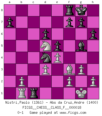 Last move : 0-1 2007 January 10 13:11:36 [Event "FICGS__CHESS__CLASS_F__000018"] [Site "FICGS"] [Date "2006.11.22"] [Round "1"] [White "Nistri,Paolo"] [Black "Abs da Cruz,Andre"] [Result "0-1"] [WhiteElo "1361"] [BlackElo "1400"] 1.e4 c5 2.Nf3 d6 3.d4 cxd4 4.Nxd4 e5 5.Nf3 Nf6 6.Nc3 Be7 7.Bc4 h6 8.O-O O-O 9.Be3 Nc6 10.Qd2 Ng4 11.Rfe1 Nxe3 12.Qxe3 Bg4 13.Be2 Bxf3 14.Bxf3 Nd4 15.Qd3 Rc8 16.Rac1 Bg5 17.Rb1 Qa5 18.a3 b5 19.g3 b4 20.axb4 Qxb4 21.Nd5 Qc4 22.Rec1 Qxd3 23.cxd3 Rxc1+ 0-1 Sicilian Kingside Castling by player White (move 8) Kingside Castling by player Black (move 8) Player Black won this chess game. Follow this game move after move (download)The isolated Pawn casts gloom over the entire chessboard. (Aaron Nimzovich) Ich hatte Angst gegen einen russischen Großmeister zu verlieren, und er befürchtete gegen einen kleinen Jungen zu verlieren. (über ein Remis gegen Juri Awerbach). (Robert James Fischer) Debió haber existido una vez en que los hombres eran semidióses, de otra manera no hubiesen podido inventar el Ajedrez. (Gustav Schenk) Des combinaisons [dans le jeu d'échecs] pareilles à des mélodies. Je crois entendre pour ainsi dire la musique des coups... (Vladimir Nabokov) I've lost money so fast in these clubs it's left me reeling. I've read every poker book ever written, but the only way to get better at the game is to go out and play with people who are really good. The problem is, you stand to lose a lot of money doing it. (Matt Damon)