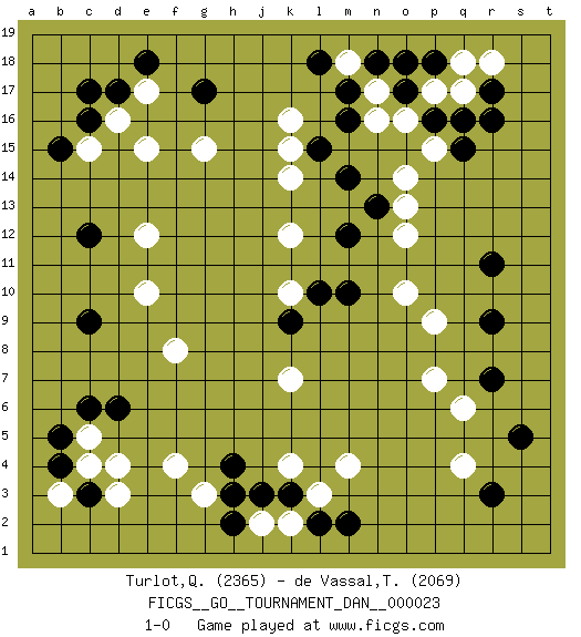 Last move : 1-0 2010 December 10 1:16:6 [Event "FICGS__GO__TOURNAMENT_DAN__000023 "] [Site "FICGS"] [Date "2010.09.22"] [Round "1"] [Black "Turlot,Quentin "] [White "de Vassal,Thibault "] [Result "1-0"] [Rating 1 "2365"] [Rating 2 "2069"] 1.q15 q4 2.c16 d4 3.c9 q17 4.r17 r18 5.r16 o16 6.r11 e17 7.g17 e15 8.m17 n17 9.m16 k16 10.d17 d16 11.c17 c15 12.e18 o14 13.m14 k14 14.m12 k12 15.p18 q18 16.n18 m18 17.o17 n16 18.l18 p17 19.o18 o12 20.p16 p15 21.q16 o10 22.m10 p9 23.r9 p7 24.r7 q6 25.s5 g15 26.c6 c5 27.d6 f4 28.h3 g3 29.h4 m4 30.m2 l3 31.l2 k2 32.k3 j2 33.h2 k4 34.j3 k10 35.c12 k7 36.l15 k15 37.n13 o13 38.l10 e12 39.c3 d3 40.b5 c4 41.b4 b3 42.b15 e10 43.r3 f8 44.k9 1-0 Here are the names of the openings (joseki) played in the four corners : Corner d4 : d4 c9Hoshi (Hwajeom, Seongjeom, Xingwei`) 4-4 Point. The star or hoshi (4-4) point, emphasizing influence at the potential expense of territory. Corner q16 : q15 q17Takamoku (Gomok, Gaomu`) 5-4 Point. The takamoku (high) point (5-4). With its emphasis on influence, the 5-4 point complements the 4-4 (hoshi) point in creating an influence-oriented fuseki.Komoku. Black responds with 3-3, 3-5, 4-6, 4-7, 3-6, 3-7. Corner d16 : c16 e17Komoku (Somok, Xiao~mu`) 3-4 Point. The komoku (3-4) point is the traditional corner enclosure move..Ikken Kakari (Hankan Keolch'im, Yi Gua`jiao~, 1-Space Low Pincer). The small knight move is the basic approach move to the 3-4 point stone. It has been continually used for over four centuries. There are limitless variations, with new moves constantly being discovered. White 2 opens the door to a treaure store of joseki. Player Black won this Go (weiqi, baduk) game.Follow this game move after move (download ) Keshi is worth as much as an invasion ! (Anonymous) If things go wrong, don't go with them. (Roger Babson)