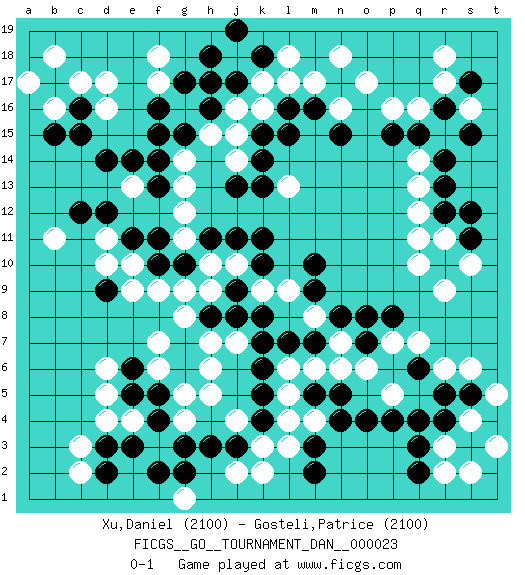 Last move : 0-1 2010 November 2 10:11:6 [Event "FICGS__GO__TOURNAMENT_DAN__000023"] [Site "FICGS"] [Date "2010.09.22"] [Round "1"] [Black "Xu,Daniel"] [White "Gosteli,Patrice"] [Result "0-1"] [Rating 1 "2100"] [Rating 2 "2100"] 1.r16 c3 2.q4 d16 3.f4 p16 4.m16 q14 5.r14 q13 6.r13 q12 7.r12 q11 8.r10 j16 9.d14 d11 10.c16 c17 11.b17 d17 12.c15 b18 13.f14 h15 14.d9 e13 15.e14 g13 16.f16 b16 17.b15 a17 18.f13 g12 19.e11 e10 20.f11 d10 21.f10 e9 22.k4 d5 23.o4 q10 24.d12 r11 25.s11 h10 26.m10 s10 27.s12 r9 28.j13 f9 29.h11 g11 30.g10 g14 31.j11 g9 32.c12 j10 33.k10 k9 34.k11 l9 35.k15 g16 36.f15 l13 37.k13 k16 38.l15 f17 39.d3 d4 40.e3 c2 41.k6 j14 42.k14 k3 43.j3 j4 44.h3 l4 45.k5 k2 46.m3 l3 47.m2 m4 48.n4 m6 49.j8 h5 50.g6 h6 51.g7 g5 52.f5 h7 53.h8 j7 54.k7 g8 55.k8 f6 56.e6 f7 57.e5 d6 58.f2 m8 59.m7 n7 60.l7 n6 61.n8 g4 62.g3 g1 63.g2 j2 64.o8 h9 65.j9 r3 66.r4 p5 67.p4 s4 68.s5 s2 69.t4 t3 70.s3 r17 71.s17 s4 72.g17 t5 73.h17 f18 74.k18 j18 75.j17 k17 76.h18 l18 77.j19 m17 78.n17 n18 79.h16 j15 80.g15 n16 81.n15 o17 82.n5 p7 83.m5 l5 84.m9 l6 85.p8 q7 86.q2 r2 87.q3 q16 88.q15 s16 89.s15 r15 90.l16 l17 91.r16 s6 92.r5 r15 93.o7 o6 94.r16 b11 95.p15 r15 96.q6 r6 97.r16 r18 98.d2 e4 0-1 Here are the names of the openings (joseki) played in the four corners : Corner d4 : c3 f4 San-San (Sam-Sam, San-San) 3-3 Point. The San-San (3-3) point, emphasizing territory at the expense of influence. Niken Takagakari (Dukan Nop'dakeolch'im, E`r Gaogua`jiao~, 2-Space High Approach). White may continue with 4-5 or 4-6. White 4-6 works well when White is in the lower right (so an extension in the middle works both ways). The more conservative 4-5 is makes a slightly tighter shape (better for a fight). Corner q16 : r16 p16 Komoku (Somok, Xiao~mu`) 3-4 Point. The komoku (3-4) point is the traditional corner enclosure move.. Ikken Takagakari (Hankan Nop'dakeolch'im, Yi Gaogua`jiao~, 1-Space High Approach). The 5-4 approach move has become more popular in modern times, as modern Go emphasizes speed and influence. Player White won this Go (weiqi, baduk) game. Follow this game move after move (download)The enemy's vital point is your own. (Anonymous) I don't know, I don't care, and it doesn't make any difference. (Albert Einstein)