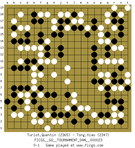 Last move : 0-1 2010 November 11 10:47:8 [Event "FICGS__GO__TOURNAMENT_DAN__000023"] [Site "FICGS"] [Date "2010.09.22"] [Round "1"] [Black "Turlot,Quentin"] [White "Tong,Xiao"] [Result "0-1"] [Rating 1 "2365"] [Rating 2 "2347"] 1.q15 d4 2.q3 d16 3.r9 n4 4.q5 k4 5.c10 q17 6.f17 k16 7.f15 c13 8.o17 p16 9.n15 n16 10.o16 p15 11.m16 q14 12.r14 r13 13.s15 s13 14.r18 q18 15.q13 p14 16.q12 r11 17.r17 r16 18.s16 q11 19.o13 s18 20.s17 r19 21.s19 t19 22.o11 p11 23.o12 p9 24.o10 q9 25.r8 h17 26.k17 f18 27.e18 g18 28.e17 l17 29.l18 k18 30.j17 j18 31.j16 h16 32.j15 m18 33.l16 m17 34.h15 e13 35.c7 g14 36.d14 d13 37.f14 f13 38.d15 b15 39.b16 c16 40.b14 b17 41.c14 c18 42.g13 e10 43.g12 c11 44.b10 e8 45.f3 e3 46.f4 d6 47.d7 e7 48.e6 c6 49.b6 b5 50.b7 f6 51.e5 c3 52.b4 b3 53.c5 d5 54.a5 f2 55.g2 e2 56.h4 h9 57.h6 h11 58.j13 j2 59.f10 g11 60.e11 f12 61.j12 f9 62.d10 e9 63.d11 f11 64.g6 g3 65.f7 k10 66.h3 h2 67.k6 k8 68.n2 g1 69.k3 l3 70.l4 l5 71.l2 m4 72.m3 l6 73.j3 q2 74.p3 r3 75.s2 r2 76.s4 r4 77.r5 s3 78.s5 p2 79.l4 o3 80.s10 s11 81.o8 p7 82.p8 q8 83.q7 r7 84.q6 s7 85.s8 t9 86.t7 t8 0-1 Here are the names of the openings (joseki) played in the four corners : Corner q16 : q15 q17 Takamoku (Gomok, Gaomu`) 5-4 Point. The takamoku (high) point (5-4). With its emphasis on influence, the 5-4 point complements the 4-4 (hoshi) point in creating an influence-oriented fuseki. Komoku. Black responds with 3-3, 3-5, 4-6, 4-7, 3-6, 3-7. Corner d16 : d16 f17 Hoshi (Hwajeom, Seongjeom, Xingwei`) 4-4 Point. The star or hoshi (4-4) point, emphasizing influence at the potential expense of territory. Ikken Kakari (Hankan Keolch'im, Yi Gua`jiao~, 1-Space Low Approach). Black 2 is the standard approach move to the 4-4. Corner d4 : d4 c7 Hoshi (Hwajeom, Seongjeom, Xingwei`) 4-4 Point. The star or hoshi (4-4) point, emphasizing influence at the potential expense of territory. Niken Kakari (Dukan Keolch'im, E`r Gua`jiao~, 2-Space Low Approach). White typically answers by 7-3 or 3-5 (which is not joseki). Player White won this Go (weiqi, baduk) game. Follow this game move after move (download)Go is to western chess what philosophy is to double entry accounting. (from Shibumi, by Trevanian) Somewhere in the world there is an epigram for every dilemma. (Hendrik Willem van Loon)
