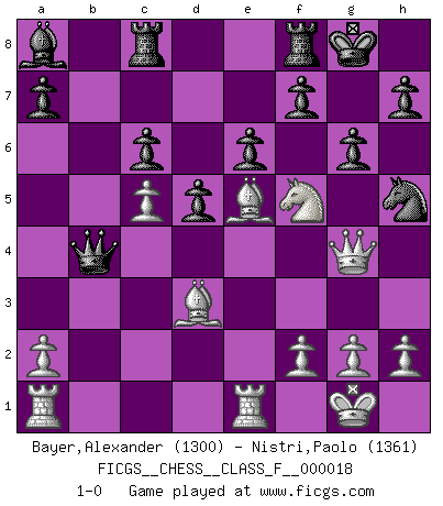 Last move : 1-0 2006 December 15 8:18:49 [Event "FICGS__CHESS__CLASS_F__000018"] [Site "FICGS"] [Date "2006.11.22"] [Round "1"] [White "Bayer,Alexander"] [Black "Nistri,Paolo"] [Result "1-0"] [WhiteElo "1300"] [BlackElo "1361"] 1.d4 d5 2.c4 c6 3.Nf3 Nf6 4.Nbd2 e6 5.e3 Bb4 6.Bd3 O-O 7.O-O Nbd7 8.e4 b6 9.e5 Bxd2 10.Nxd2 Bb7 11.exf6 Nxf6 12.Re1 Rc8 13.c5 bxc5 14.dxc5 Qe7 15.Nb3 Nd7 16.Qg4 Nf6 17.Qa4 Ba8 18.Bf4 Qd7 19.Be5 Nh5 20.Qg4 g6 21.Nd4 Qb7 22.b4 Qxb4 23.Nf5 1-0 QGD Slav : Breyer variation Kingside Castling by player Black (move 6) Kingside Castling by player White (move 7) Player White won this chess game. Follow this game move after move (download)The passed pawn is a criminal, who should be kept under lock and key. Mild measures, such as police surveillance, are not sufficient. (Nimzovitch) Ich habe kein Problem mit Frauen, sondern nur mit dem Niveau ihres Schachspiels (Judith Polgar) El Ajedrez es una guerra en un tablero. El objetivo es aplastar la mente del oponente. (Bobby Fischer) La victoire dans une partie d'Echecs appartient la plupart du temps à celui qui voit un peu plus loin que l'adversaire. (Lasker) Real knowledge is to know the extent of one's ignorance. (Confucius)
