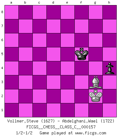 Last move : 1/2-1/2 2010 December 6 21:51:33 [Event "FICGS__CHESS__CLASS_C__000157"] [Site "FICGS"] [Date "2010.09.22"] [Round "1"] [White "Vollmer,Steve"] [Black "Abdelghani,Wael"] [Result "1/2-1/2"] [WhiteElo "1627"] [BlackElo "1722"] 1.d4 Nf6 2.c4 c5 3.d5 e6 4.Nc3 exd5 5.cxd5 d6 6.e4 g6 7.Nf3 Bg7 8.Be2 O-O 9.O-O Re8 10.Qc2 a6 11.a4 b6 12.h3 Nbd7 13.Bf4 Ne5 14.Nxe5 dxe5 15.Bg5 h6 16.Bh4 Qc7 17.Rfd1 Qd6 18.Rac1 Bd7 19.b3 Rec8 20.Qd3 Ne8 21.g4 Nc7 22.Qf3 b5 23.Bd3 Rab8 24.axb5 axb5 25.Ne2 Ne8 26.Rc3 Qb6 27.Rdc1 Nd6 28.Qe3 c4 29.Qxb6 Rxb6 30.bxc4 bxc4 31.Bxc4 Nxe4 32.R3c2 Rb4 33.Be7 R4b8 34.Ba6 Re8 35.Bh4 Nd6 36.Rc7 Bb5 37.Bxb5 Rxb5 38.R1c5 Rxc5 39.Rxc5 Rc8 40.Rxc8+ Nxc8 41.Bd8 Bf8 42.Nc3 Nd6 43.f3 f5 44.Kf2 Kf7 45.Ke2 Be7 46.Bc7 Ke8 47.Kd3 Kd7 48.Bb8 Bd8 49.Ba7 Ba5 50.Be3 Bxc3 51.Kxc3 h5 52.Bh6 Ne8 53.Kc4 Nf6 54.g5 Ne8 55.Kc5 Ke7 56.h4 Kf7 57.Kc4 f4 58.Kd3 Nd6 59.Kc3 Nf5 60.Kd3 Ng3 61.Kd2 e4 62.fxe4 Nxe4+ 63.Ke1 Nc3 64.d6 Ke6 65.d7 Kxd7 66.Kd2 Nd5 67.Ke2 Ke6 68.Kf3 Kf5 69.Bf8 Nc7 70.Bc5 Ne6 71.Bb6 Ke5 72.Bf2 Ng7 73.Be1 Kf5 74.Ba5 Ne6 75.Bb6 Nxg5+ 76.hxg5 Kxg5 77.Bc7 Kf5 78.Bxf4 g5 79.Bc7 h4 80.Bd6 g4+ 81.Kg2 g3 82.Bxg3 1/2-1/2 Benoni : Classical with e4 and Nf3 Kingside Castling by player Black (move 8) Kingside Castling by player White (move 9) 10 pieces endgame at move 62 : White KBPPP , Black KNPPP WHITE : King + 1 Bishop 3 Pawns BLACK : King + 1 Knight 3 Pawns 9 pieces endgame at move 65 : White KBPP , Black KNPPP WHITE : King + 1 Bishop 2 Pawns BLACK : King + 1 Knight 3 Pawns 8 pieces endgame at move 75 : White KBP , Black KNPPP WHITE : King + 1 Bishop 1 Pawn BLACK : King + 1 Knight 3 Pawns 7 pieces endgame at move 76 : White KBP , Black KPPP WHITE : King + 1 Bishop 1 Pawn BLACK : King + 3 Pawns 6 pieces endgame at move 76 : White KB , Black KPPP WHITE : King + 1 Bishop BLACK : King + 3 Pawns 5 pieces endgame at move 78 : White KB , Black KPP WHITE : King + 1 Bishop BLACK : King + 2 Pawns 4 pieces endgame at move 82 : White KB , Black KP WHITE : King + 1 Bishop BLACK : King + 1 Pawn This chess game ended in a draw. Follow this game move after move (download)We must make sure that Chess will not be like a dead language, very interesting, but for a very small group. (Sytze Faber) Modernes Schach erfordert enorme Anspannung. Es ist für einen normalen Menschen unmöglich das auszuhalten. (Viktor Kortschnoi) Tu sabes, camarada Pachman, no disfruto el ser un Ministro, preferería jugar al Ajedrez como tu. (Che Guevara) Aux échecs, les retours au sommet sont rares : les dommages psychologiques consécutifs à une défaite sont trop sévères. (Daily Telegraph) As the days dwindle down... to a precious few. (Maxwell Anderson)